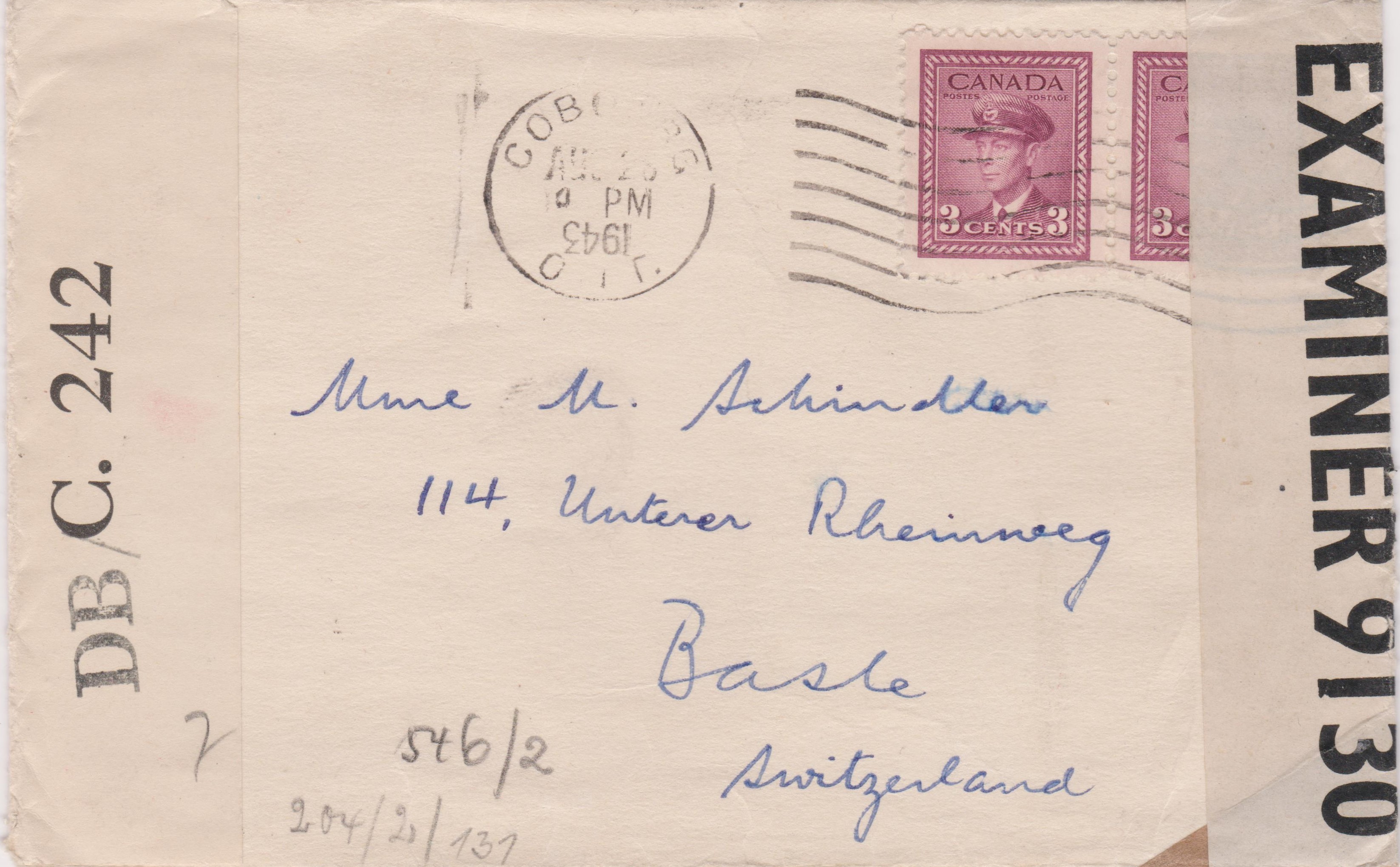 Brief aus Kanada, aufgegeben in COBOURG, entwertet mit Tagesstempel mit kopfstehender Jahreszahl "1943"(!) adressiert nach Basel: