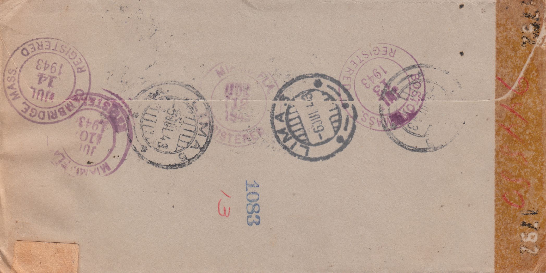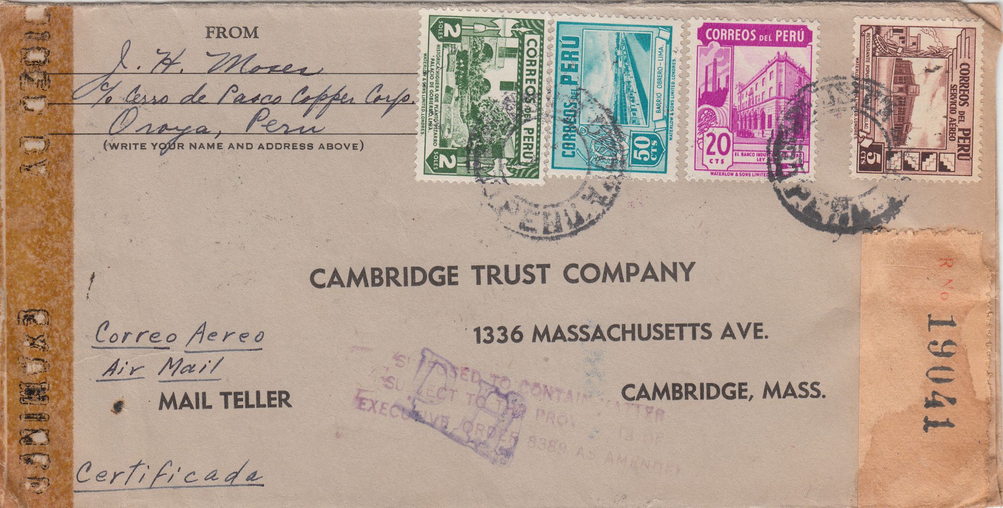 Gemäß EO 8389 wurden in den USA Postsendungen einer Devisenzensur unterzogen, was durch einen Hinweisstempel "SUPPOSED TO CONTAIN MATTER SUBJECT TO THE PROVISIONS OF EXECUTED ORDER 8389 AS AMENDED" dokumentiert wurde, hier 1943 auf einem Brief aus Peru nach Cambridge in Massachusetts: