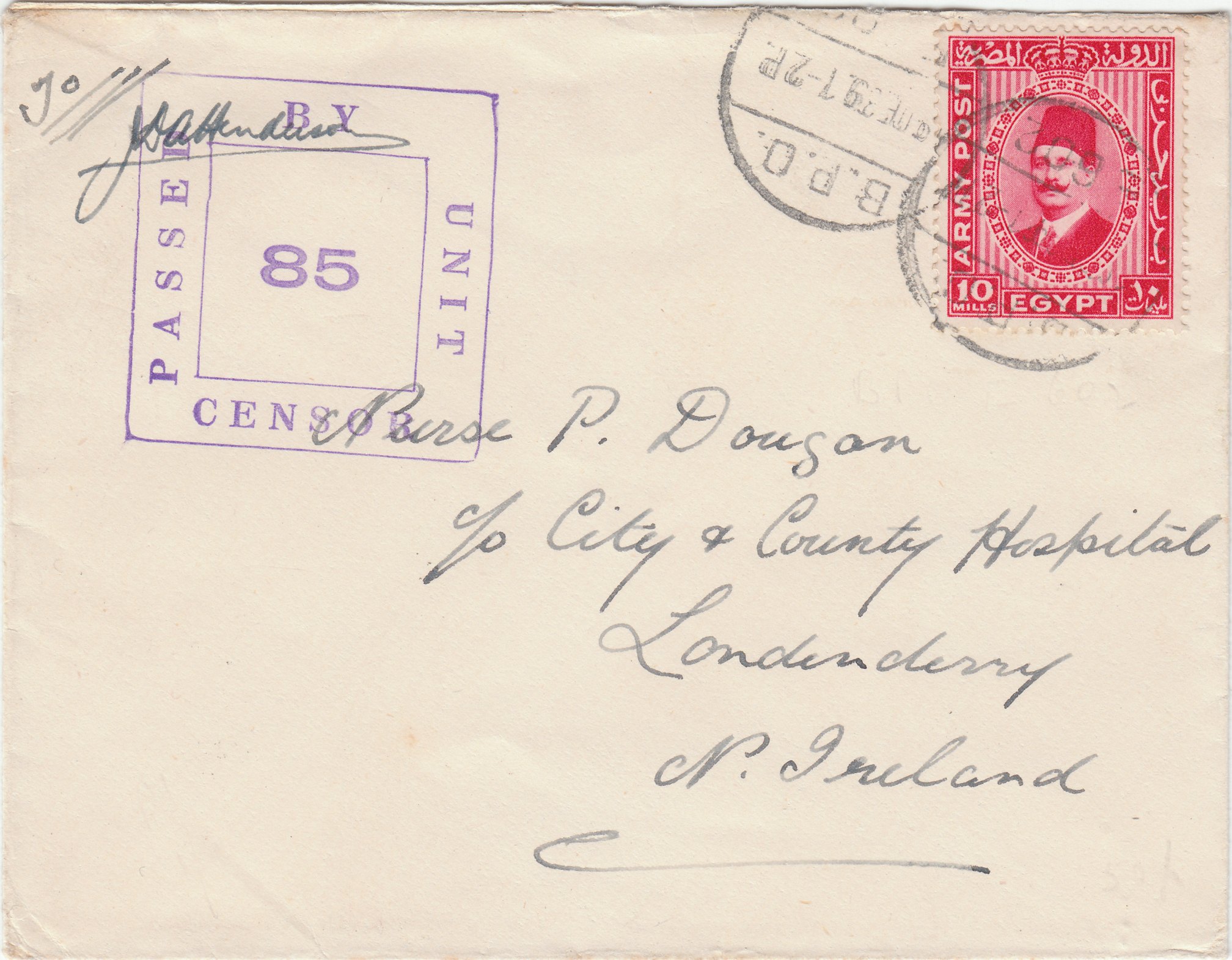 Britische Feldpost wie dieser Brief aus Ägypten nach Nordirland aus dem Dezember 1939 wurde während des Zweiten Weltkriegs mit Tagesstempeln wie dem hier gezeigten "B. P. O. 602" entwertet: