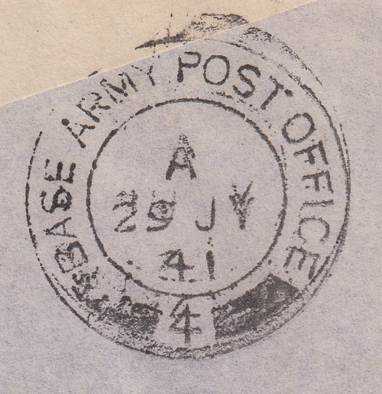 Rückseitig trägt der Beleg einen Tagesstempel "BASE ARMY POST OFFICE 4", Kennbuchstabe "A", vom 29.07.1941: