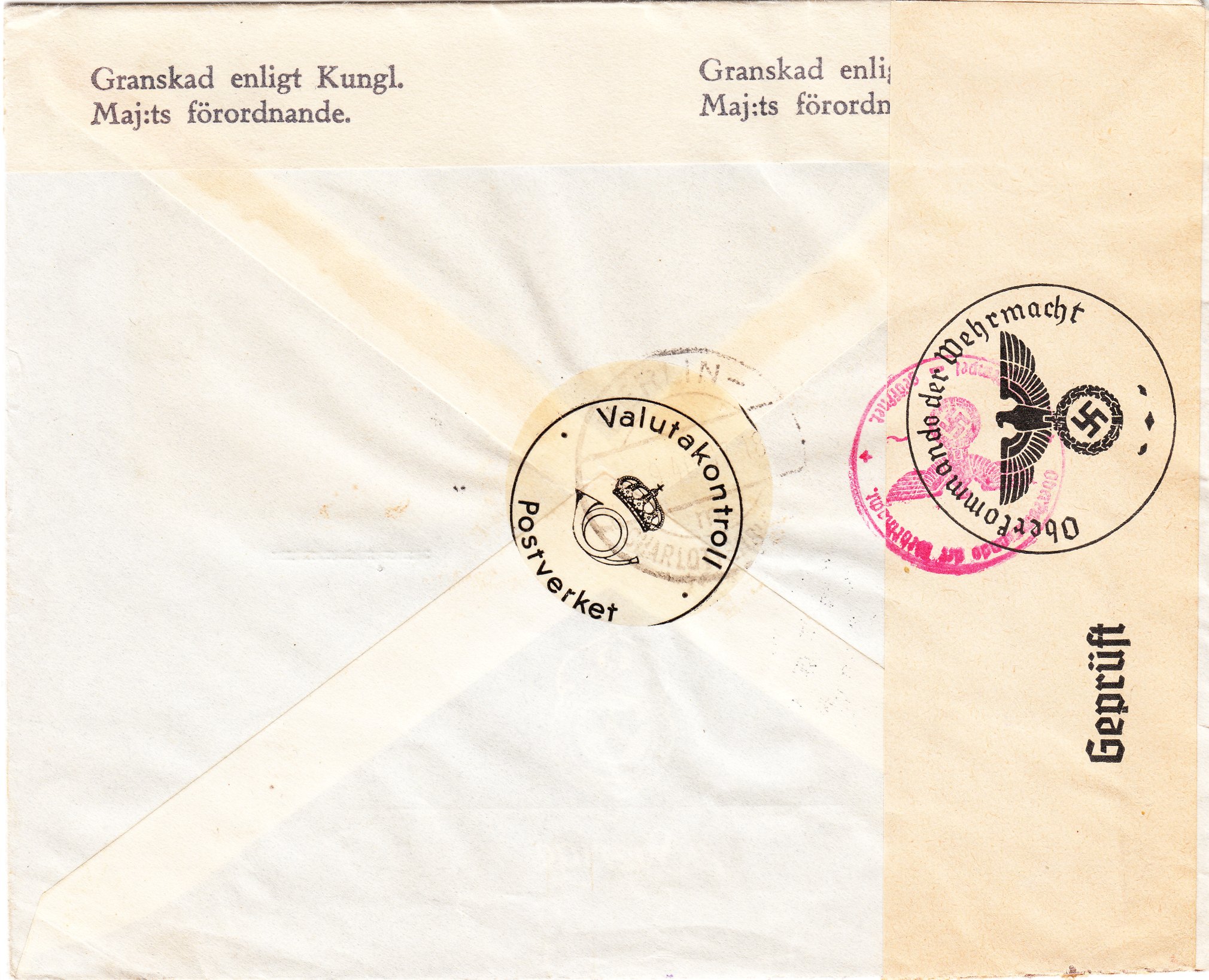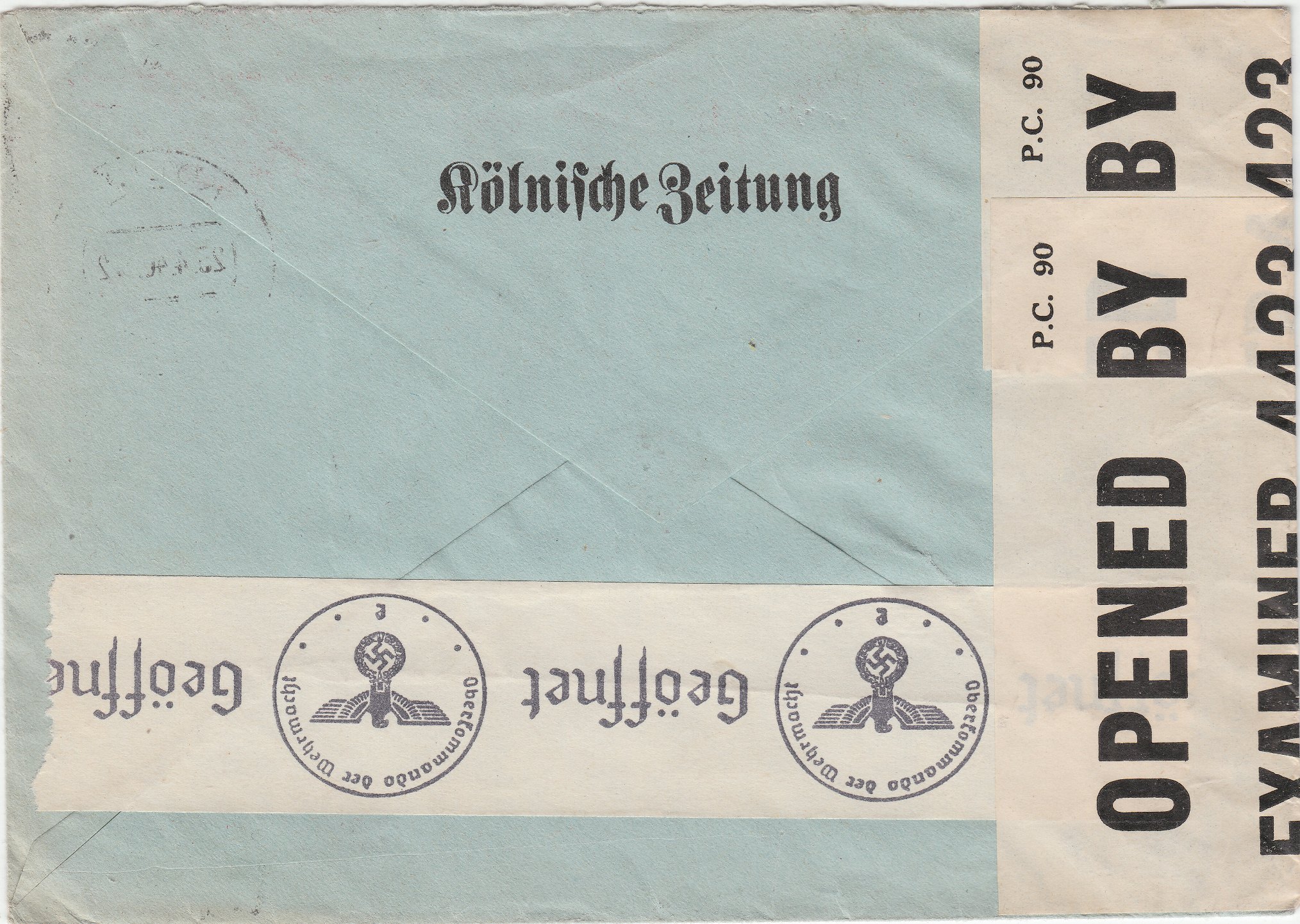Anschließend lief der Brief durch die Auslandsbriefprüfstelle München, die für Post von und nach Italien zuständig war. Dort wurde der Beleg linksseitig geöffnet und nach erfolgter Zensurierung mit der Briefverschlußvorrichtung wieder verschlossen, was mit einem Stempel der Briefverschlußvorrichtung "OKW" in Blau dokumentiert wurde.