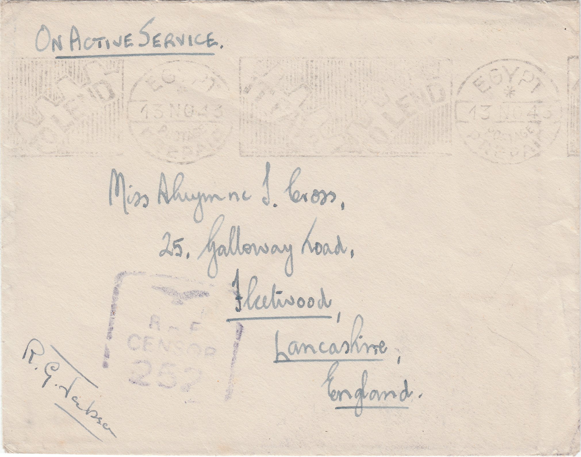 Dieser nach "Fleetwood, Lancashire, England" adressierte Brief wurde am 15.11.1943 in Ägypten aufgegeben: