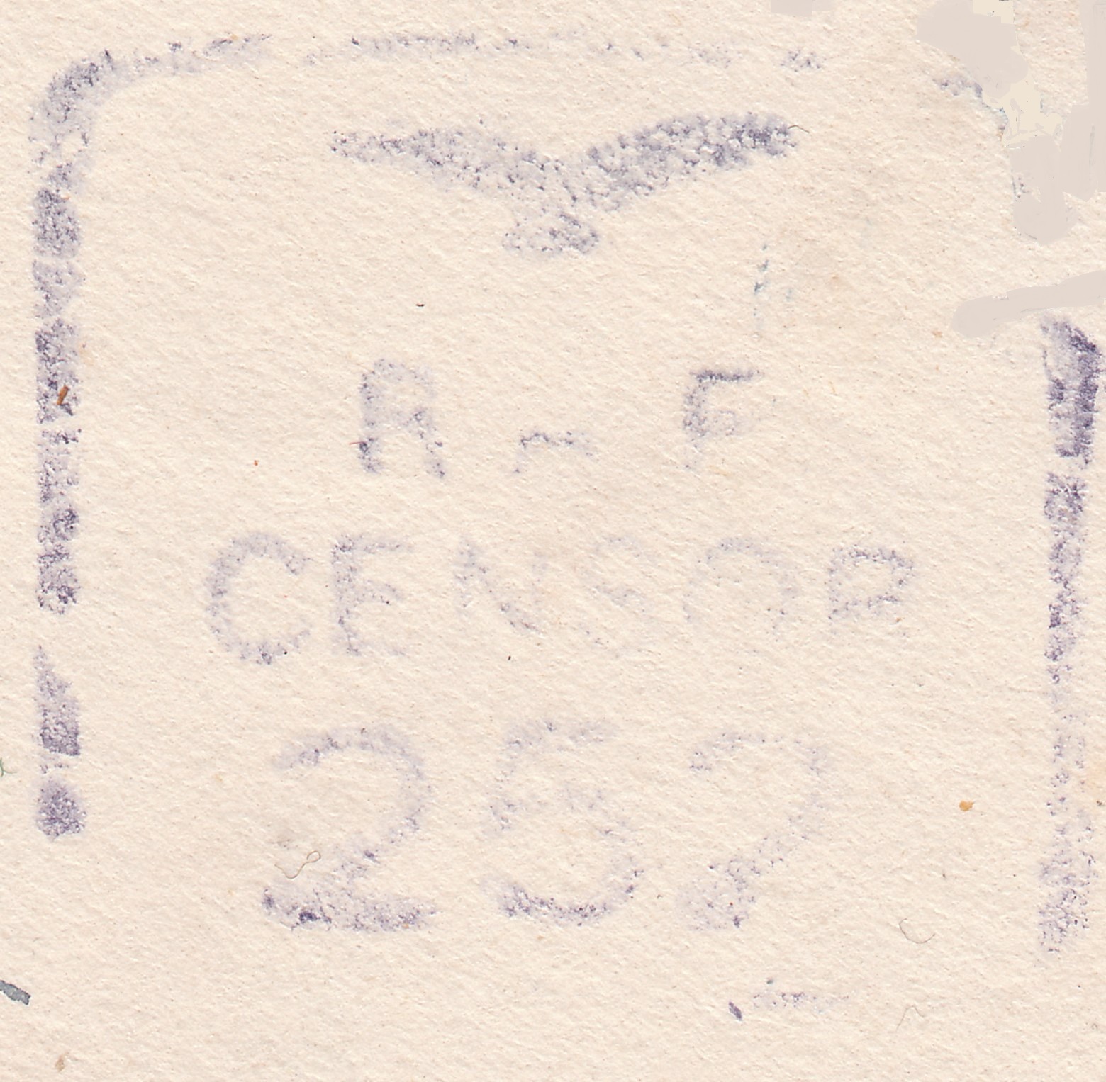 Anschließend lief der Beleg durch die britische Zensur, wo ein Zensurstempel in Form eines Quadrats von 30 mm Seitenlänge "(stilisierter Vogel) RAF CENSOR 252" abgeschlagen wurde: