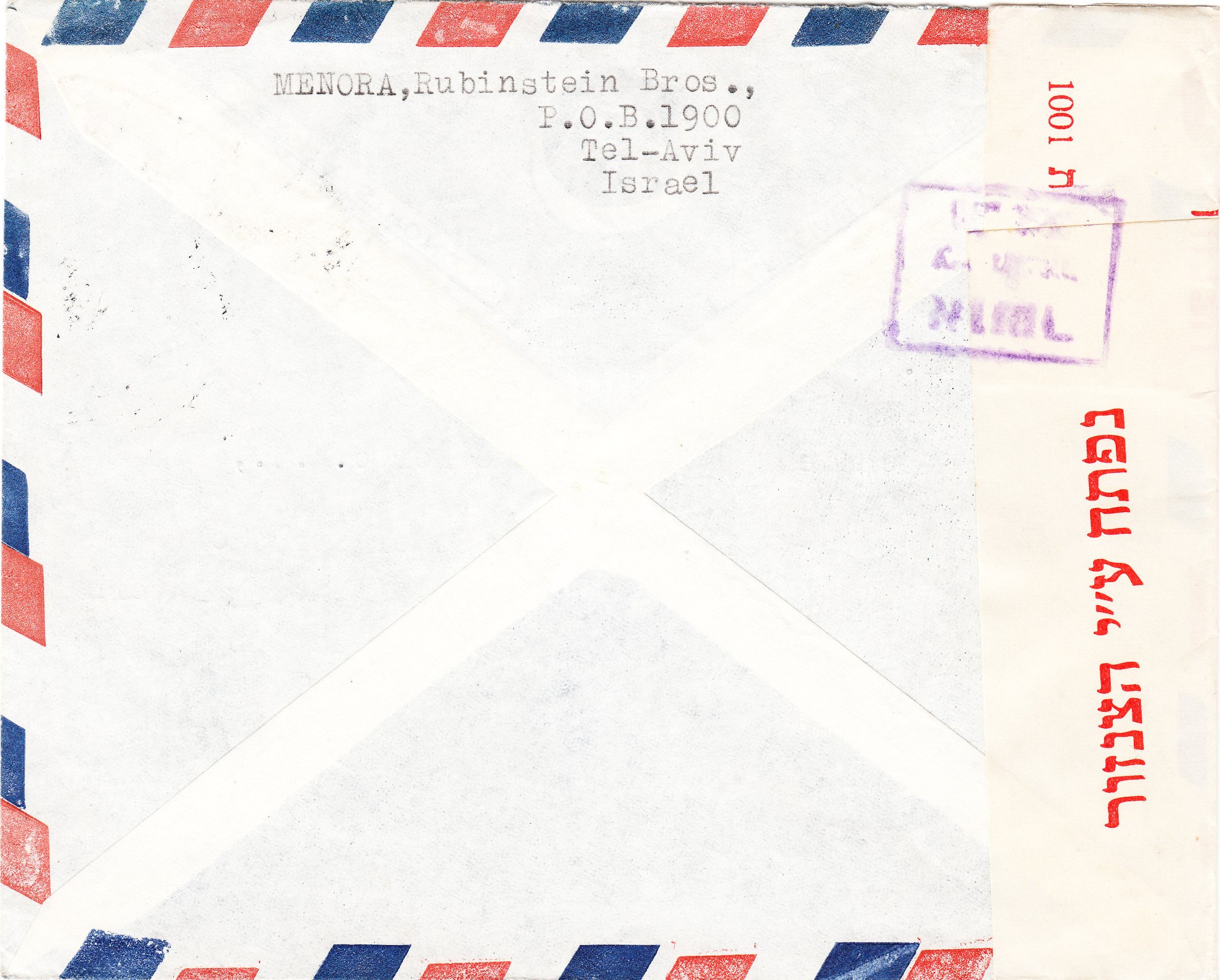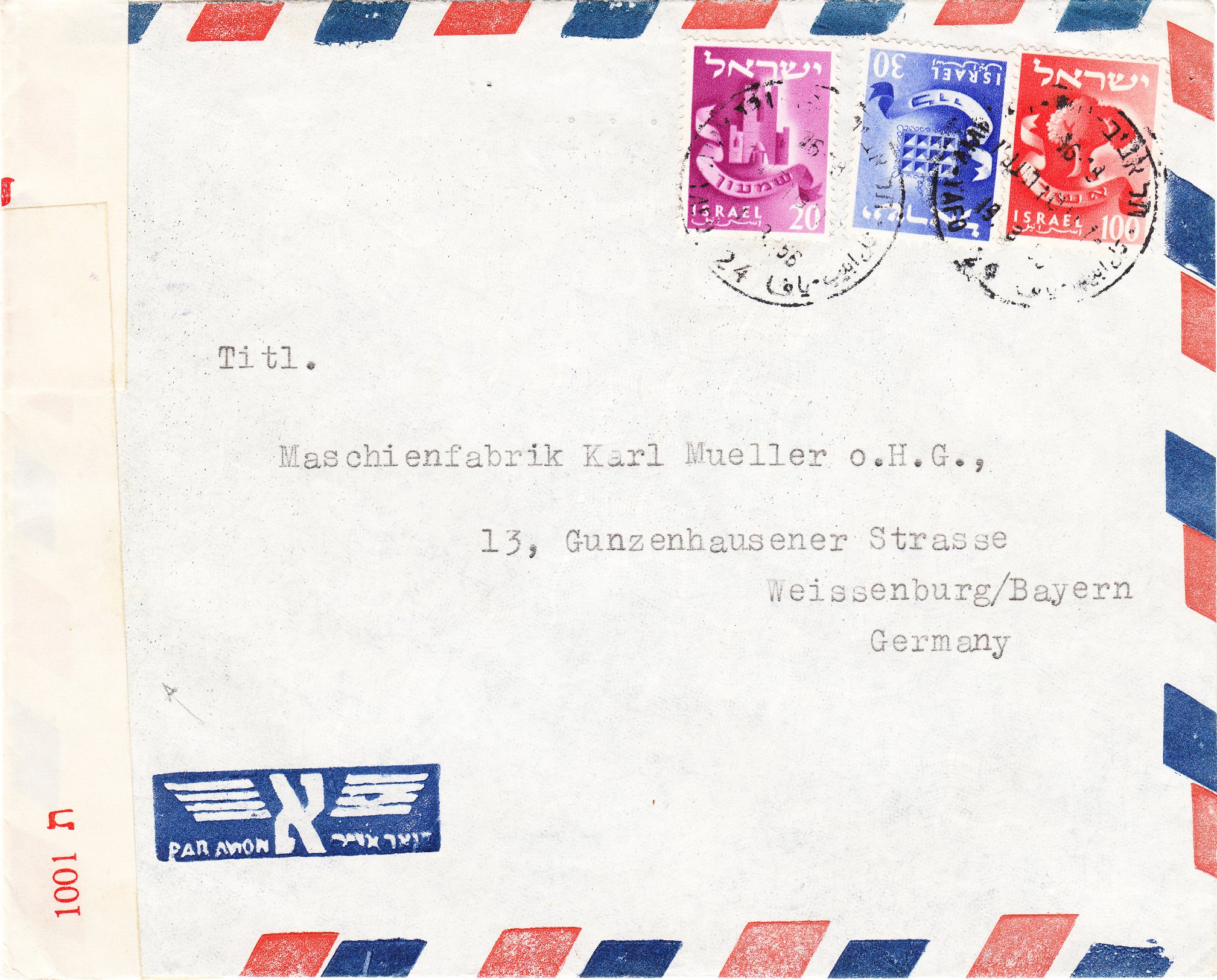 Dieser nach Weissenburg in Bayern adressierte, am 19.03.1956 in Tel Aviv aufgegebene Brief durchlief die Zensurstelle für Zivilpost. Dort wurde der Beleg linksseitig geöffnet und nach erfolgter Zensurierung mit zwei Verschlußzetteln mit Text in Rot in hebräischer Sprache sowie Druckvermerk "1001" wieder verschlossen, was rückseitig ein dreizeiliger Kastenstempel 28 x 21 mm in Violett mit Text in hebräischer Sprache dokumentierte: