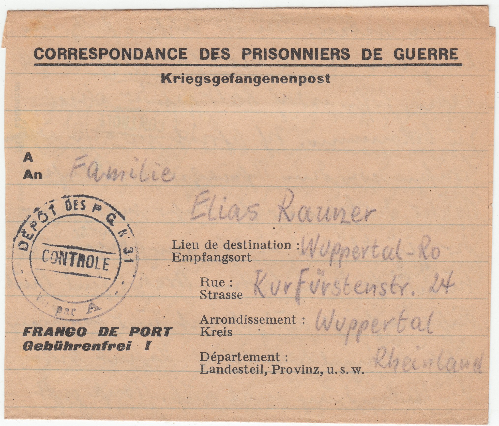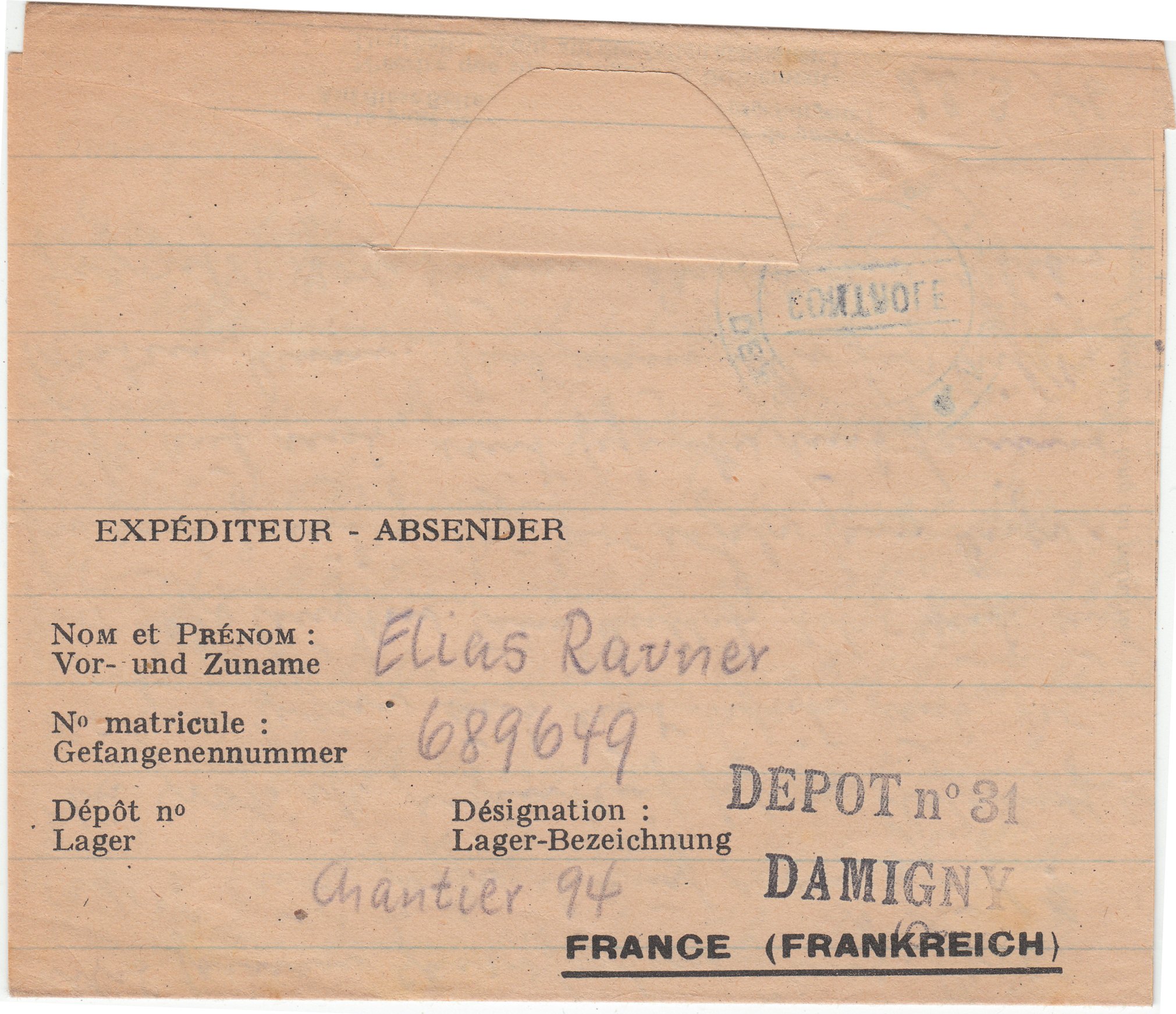 Dieser Brief wurde am 22.03.1946 geschrieben von einem kriegsgefangenen deutschen Soldaten aus dem französischen Kriegsgefangenenlager "DEPOT n° 31 DAMIGNY (Orne)", siehe rückseitiger Absenderstempel: