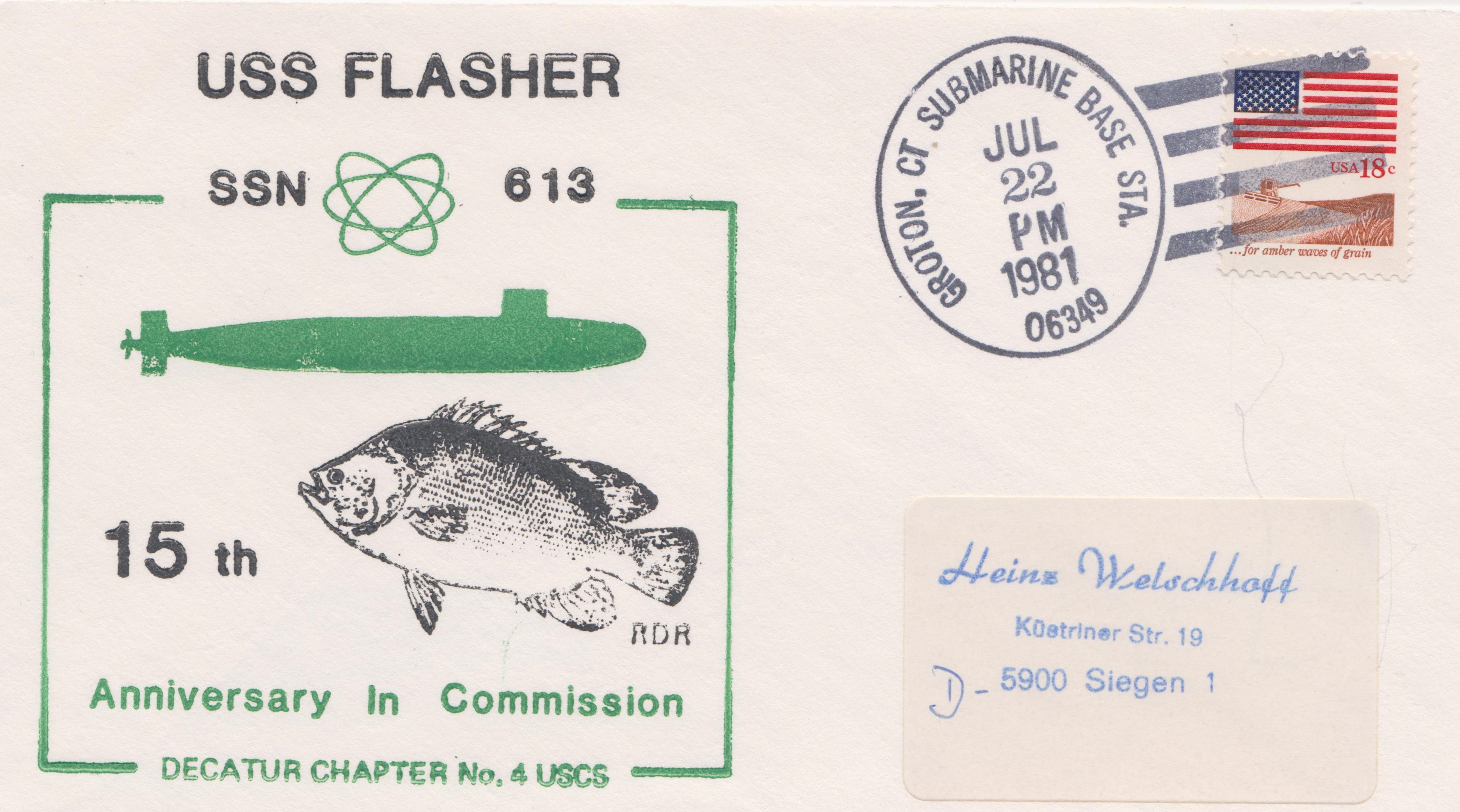 Diese Beleg vom 22.07.1981 dokumentiert den 15. Jahrestag der Indienststellung der USS FLASHER (SSN-613):