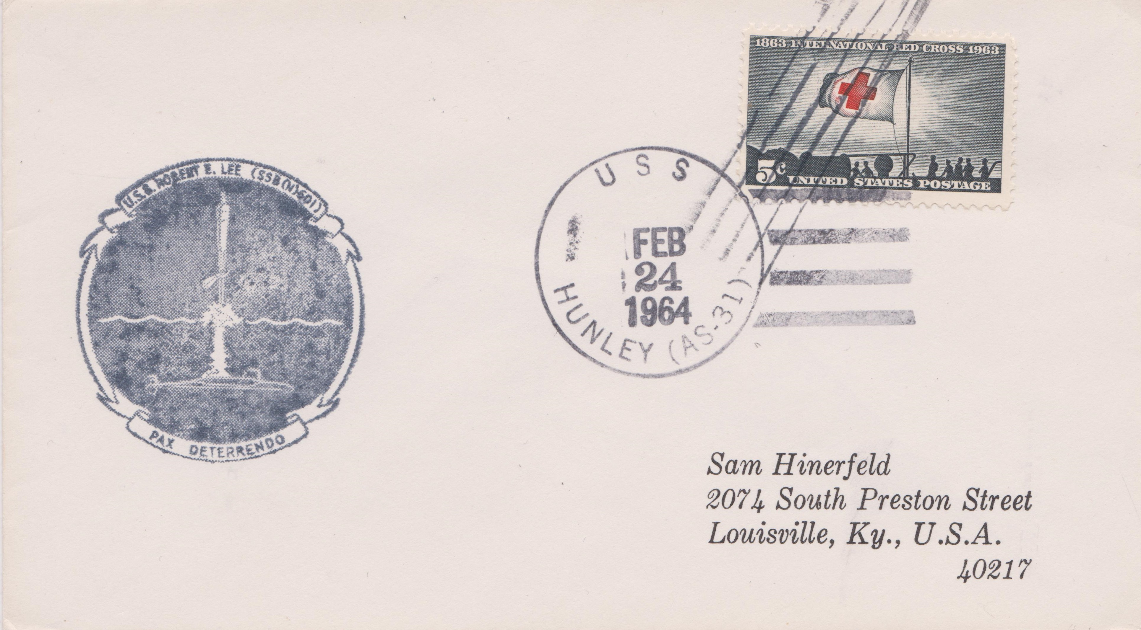 Dieser Beleg der USS ROBERT E. LEE (SSBN-601) lief am 24.02.1964 über den U-Boot-Tender USS HUNGLEY (AS-31):