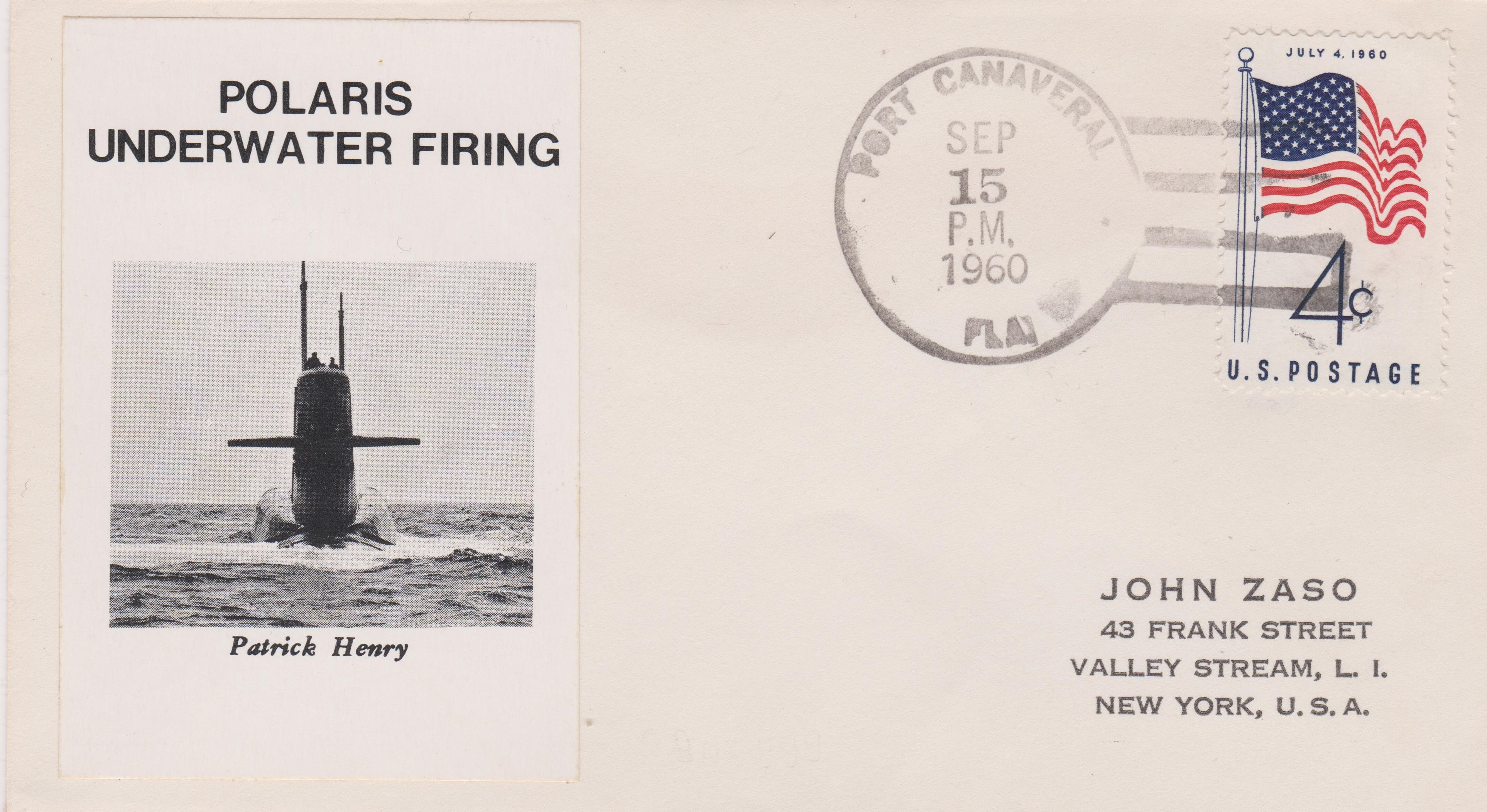 Dieser Beleg vom 15.09.1960 dokumentiert den Unterwasserstart eines POLARIS-Flugkörpers von Bord der USS PATRICK HENRY (SSBN-599):