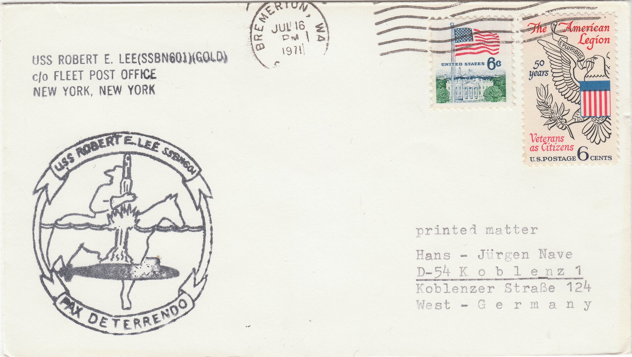 Dieser Beleg der USS ROBERT E. LEE (SSBN-601) wurde am 16.07.1971 während eines Aufenthaltes vom 27.01.1971 bis zum 11.12.1971 im Trockendock im Puget Sound Naval Shipyard in BREMERTON, Washington, aufgegeben: