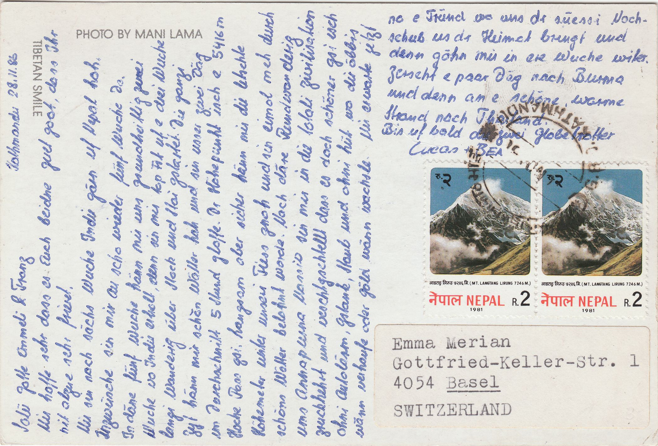 Diese Postkarte aus Nepal zeigt eine MeF von zwei Exemplaren eines Postwertzeichens, das den Langtang Lirung zeigt und dessen Höhe mit 7246 m angibt!