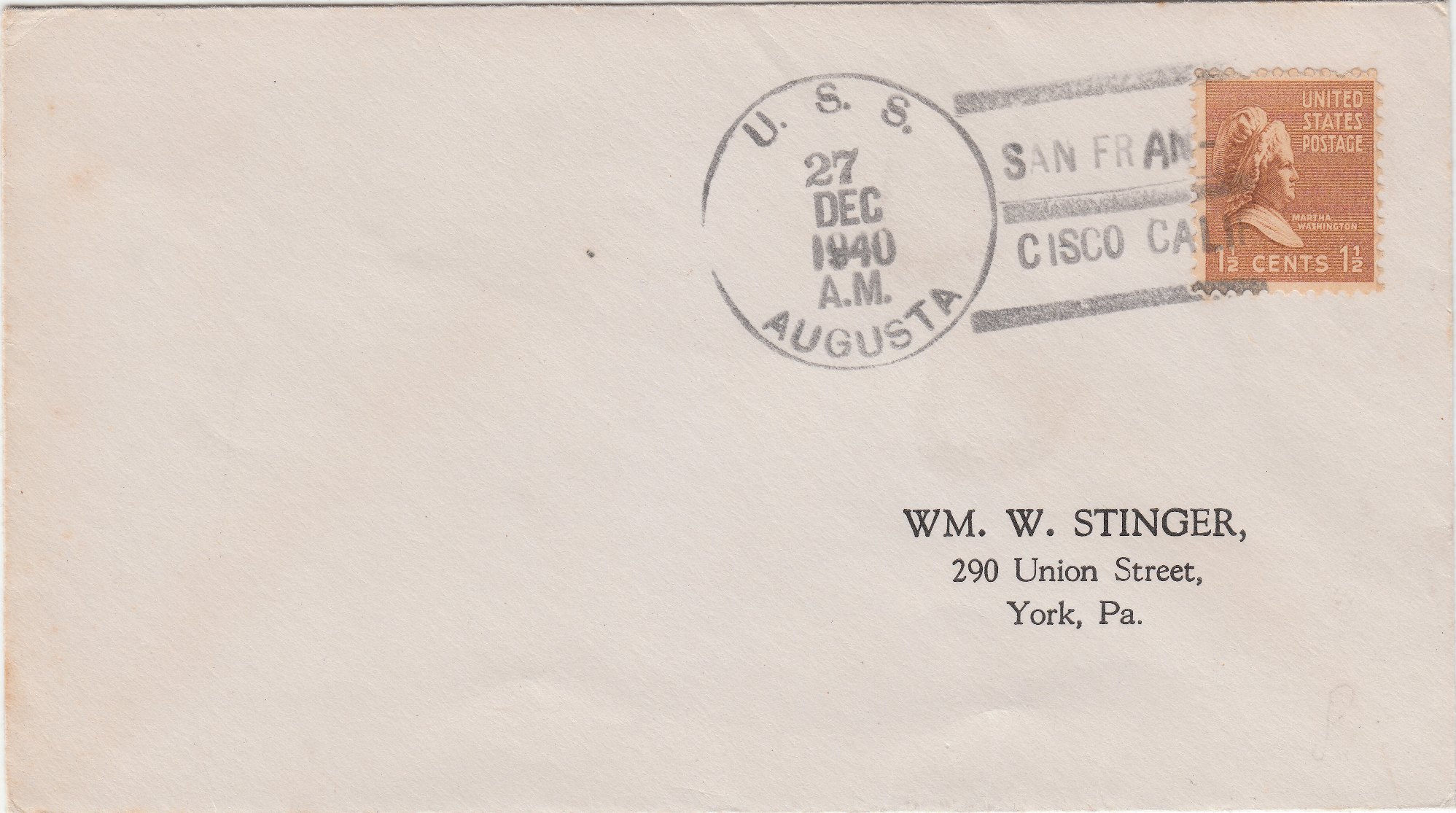 Dieser Beleg vom 27.12.1940 dokumentiert per Texteinsatz, daß sich die USS AUGUSTA zu diesem Zeitpunkt in San Francisco aufhielt: