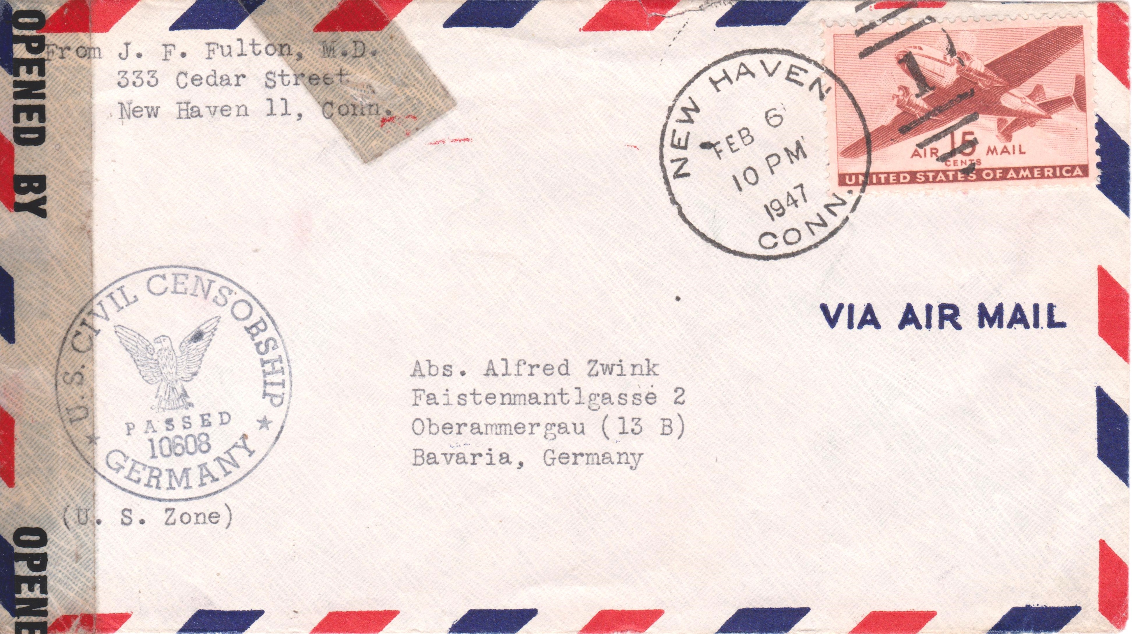 Luftpostbrief nach Oberammergau, aufgegeben am 06.02.1947 in NEW HAVEN, CONN.: