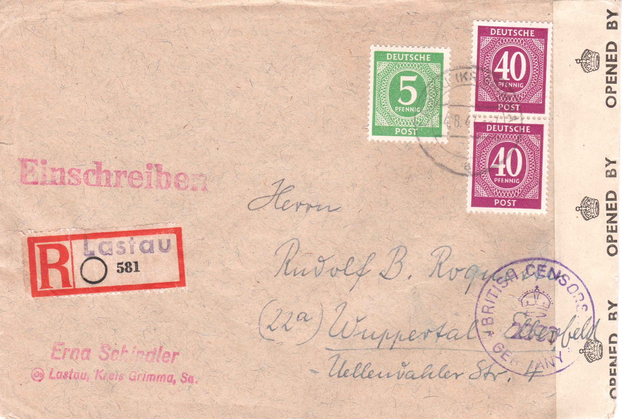 Dieser nach Wuppertal adressierte Fernbrief (24 Pf) wurde per Einschreiben (60 Pf) im August 1947 in "Lastau" aufgegeben: