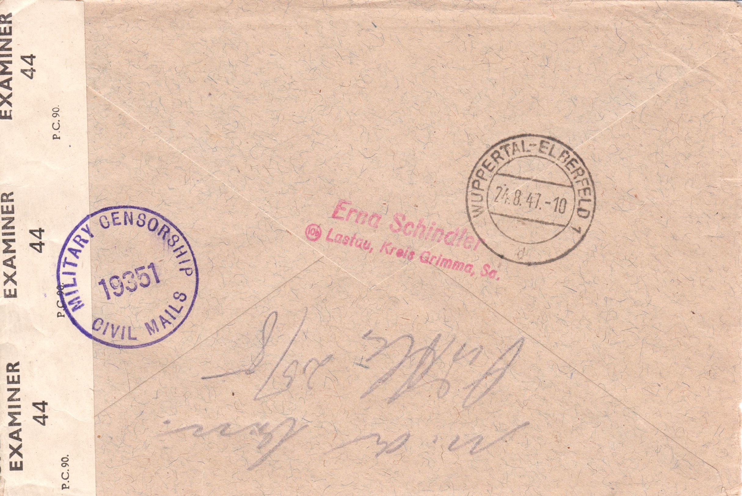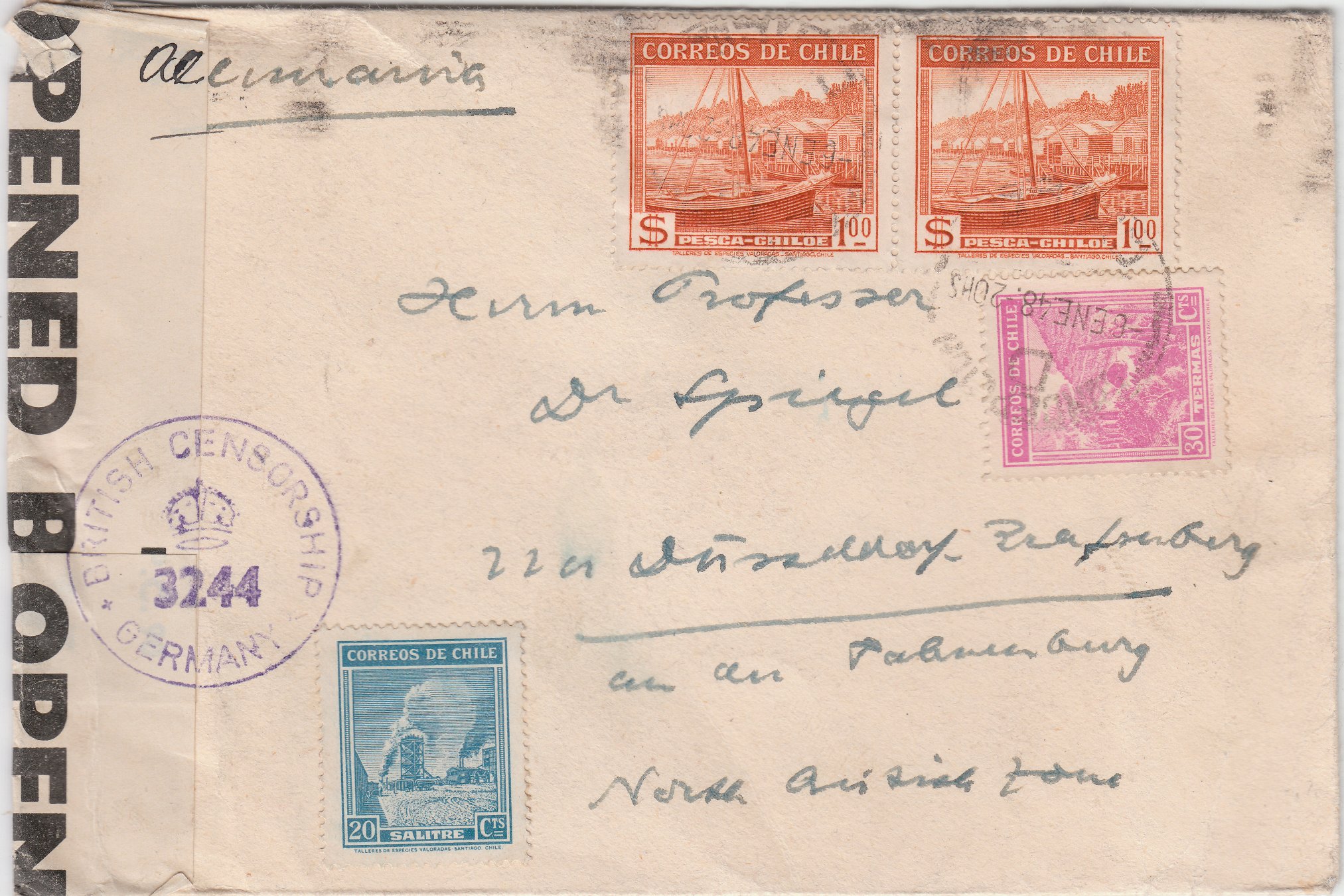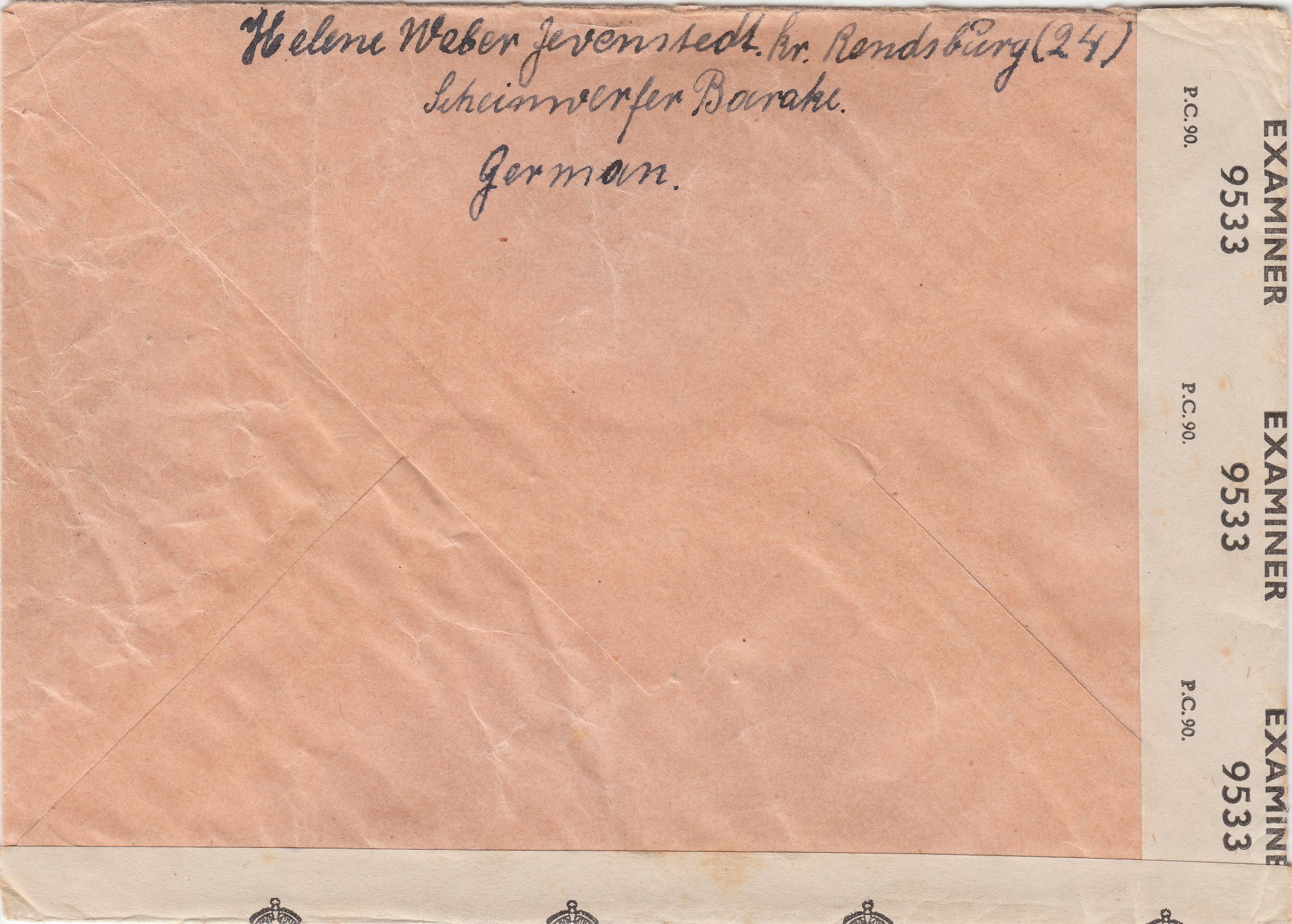 In Deutschland angekommen lief der Brief durch die britische Zensurstelle, wo er linksseitig geöffnet und mit einem Verschlußstreifen "P.C. 90 OPENED BY EXAMINER 4726" wieder verschlossen wurde, was ein vorderseitig abgeschlagener Prüfstempel "BRITISH CENSORSHIP GERMANY 3244" in Violett dokumentiert.