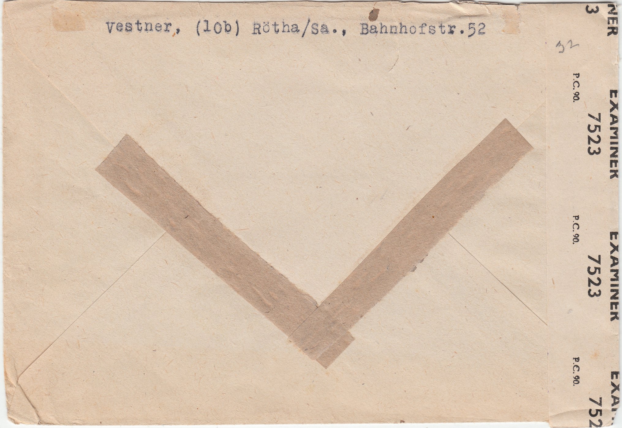 Der Brief wurde in der britischen Zensurstelle linksseitig geöffnet und mit einem Verschlußstreifen "OPENED BY EXAMINER 7523 P.C. 90." wieder verschlossen wurde, was ein vorderseitig abgeschlagener Prüfstempel "BRITISH CENSORSHIP GERMANY 0688" in Violett dokumentiert.
