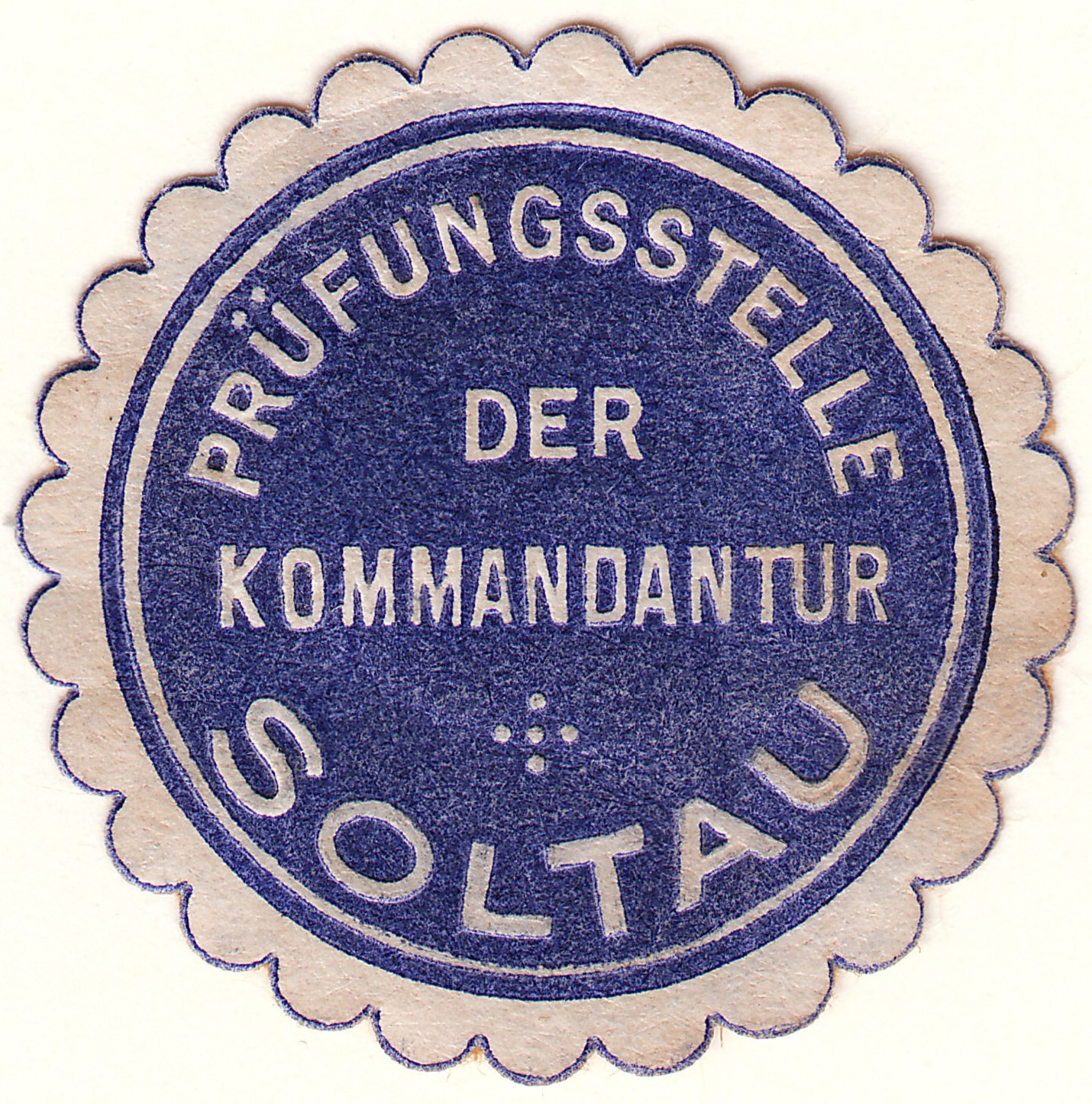 Nur von einem einzigen Lager - nämlich Soltau - ist bisher eine Verschlußmarke für Kriegsgefangenenppost bekannt. Sie trägt auf schieferblauem Grund den negativen weißten Text "PRÜFUNGSSTELLE DER KOMMANDANTUR SOLTAU":