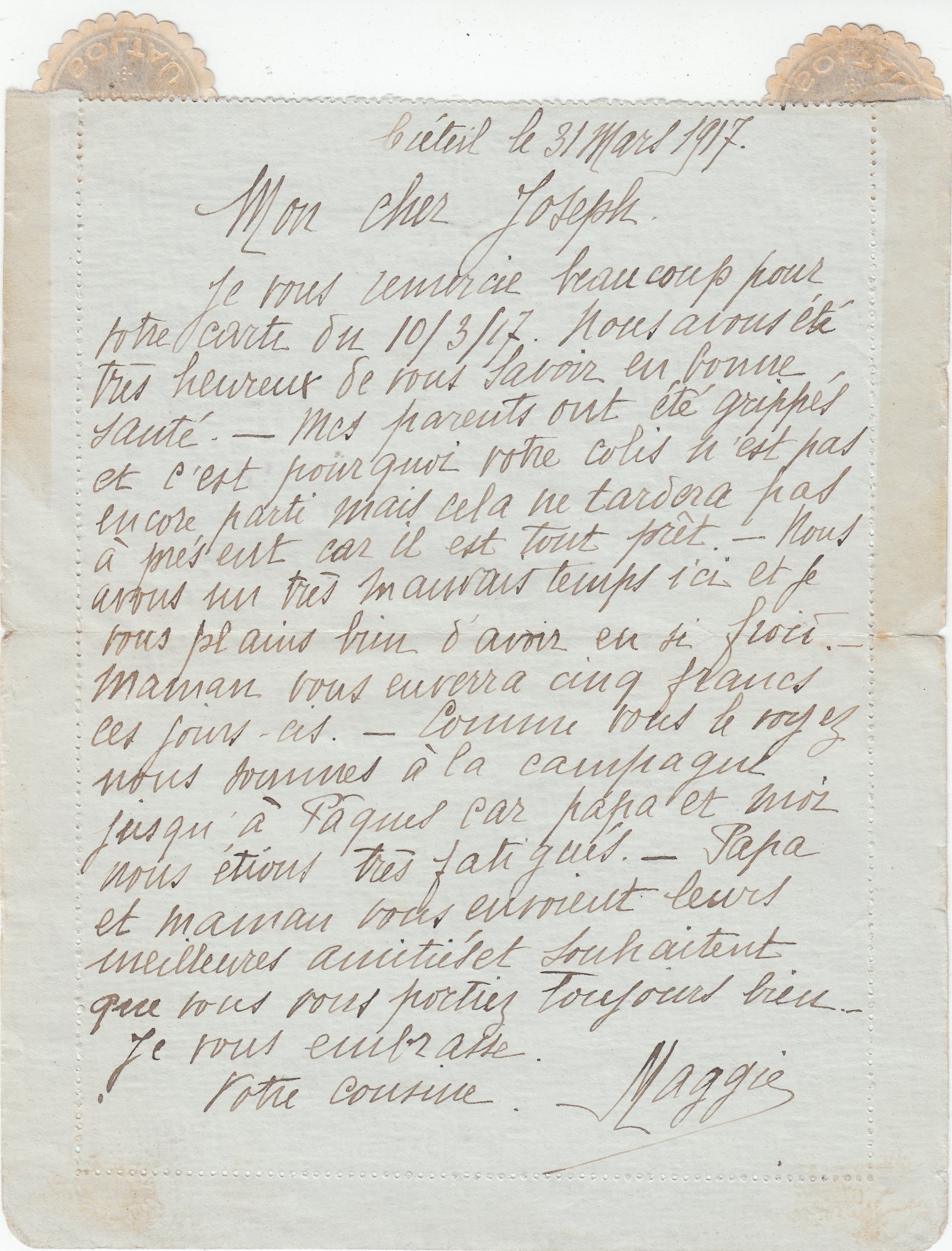 Dieser Kartenbrief wurde am 31.03.1917 in Frankreich geschrieben und am 01.04.1917 bei der Post in JOINVILLE aufgegeben.
