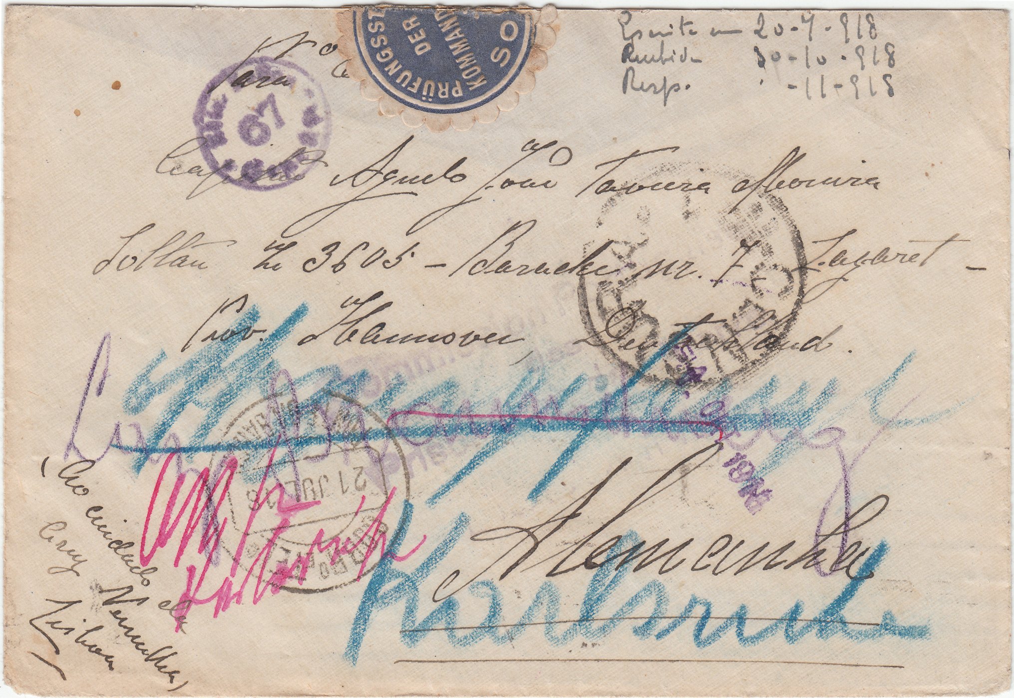 Dieser interessante Brief, geschrieben am 20.07.1918 und adressiert an das Zweiglager "Z 3605 Baracke Nr. 7", wurde am oberen Rand ebenfalls mit einer Verschlußmarke der "PRÜFUNGSSTELLE DER KOMMANDANTUR SOLTAU" verschlossen: