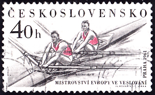 Eine rümänische Marke aus dem Jahr 1962 zeigt so einen Doppelzweier (ohne Steuermann).