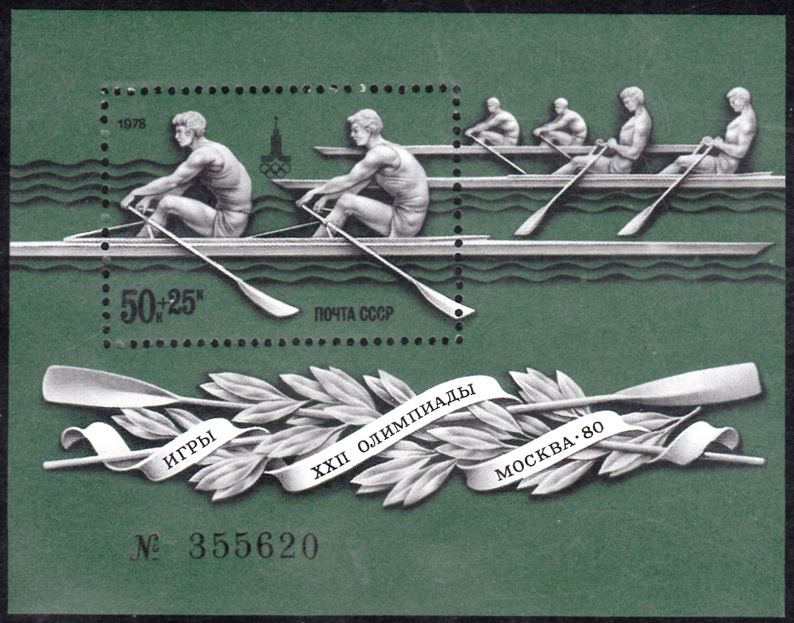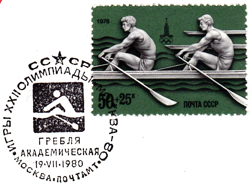 Aus einem Block aus dem Jahre 1978 (MiNr Block 127) stammt diese hier verklebte Marke (MiNr 4712) aus der Sowjetunion mit der Abbildung eines Doppelzweier mit einem zum Motiv passenden Sonderstempel "Rudern"zu den Olympischen Spielen 1980 in Moskau.