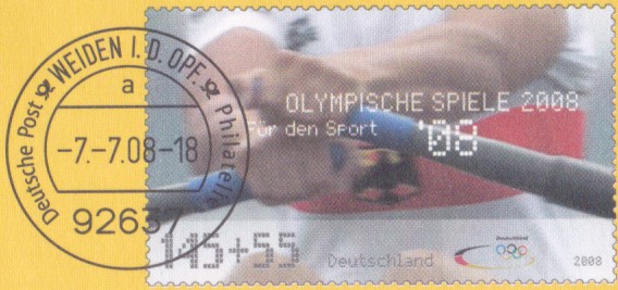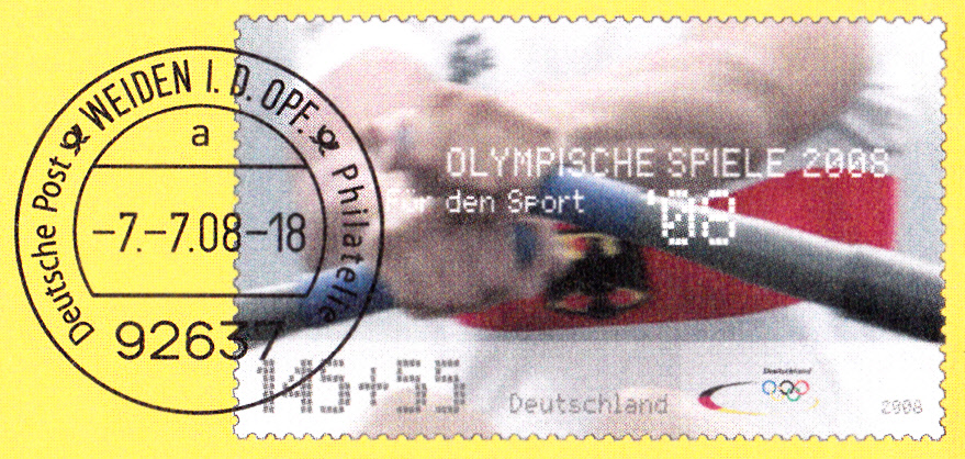 Die bereits von Christian im ersten Beitrag gezeigte Marke (MiNr 2652) aus der Serie der Sporthilfemarken 2008 wurde auf Ganzsachen der Eigenausgaben der Deutschen Post AG - Philatelie Weiden als Wertzeicheneindruck benutzt. Hier der Ganzsachenumschlag (MiNr EA F343) im Format 229x114 mm mit diesem Wertstempel zu 145+55 Cent. Die Vorausentwertung hat das Datum "-7.-7.08".