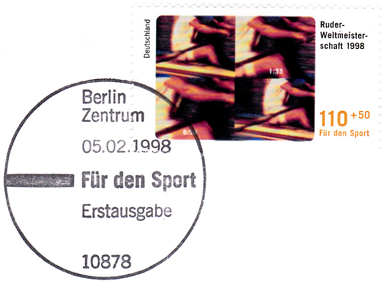 Zur Ruder-Weltmeisterschaft in Köln-Fühlingen 1998 erschien bei der Deutschen Post am 5.2.1998 in der Serie "Für den Sport" eine Zuschlagsmarke (MiNr 1970). Hier eine Marke mit dem Ersttagsonderstempel Berlin.