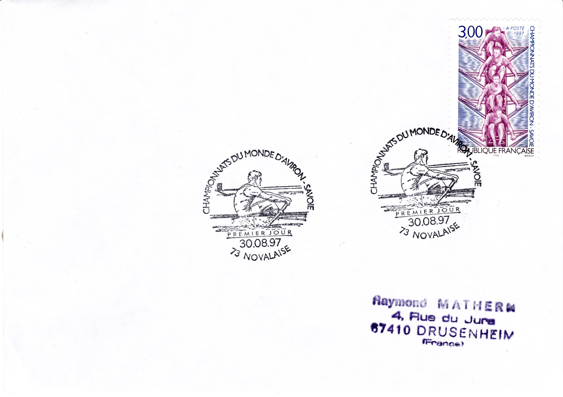 Im Ersttagsonderstempel aus Novalaise (einer kleinen Gemeinde in der Nähe des Lac d’Aiguebelette) zu dieser Marke wird ein einzelner Ruderer eines Doppelvierer (?) im Boot gezeigt.