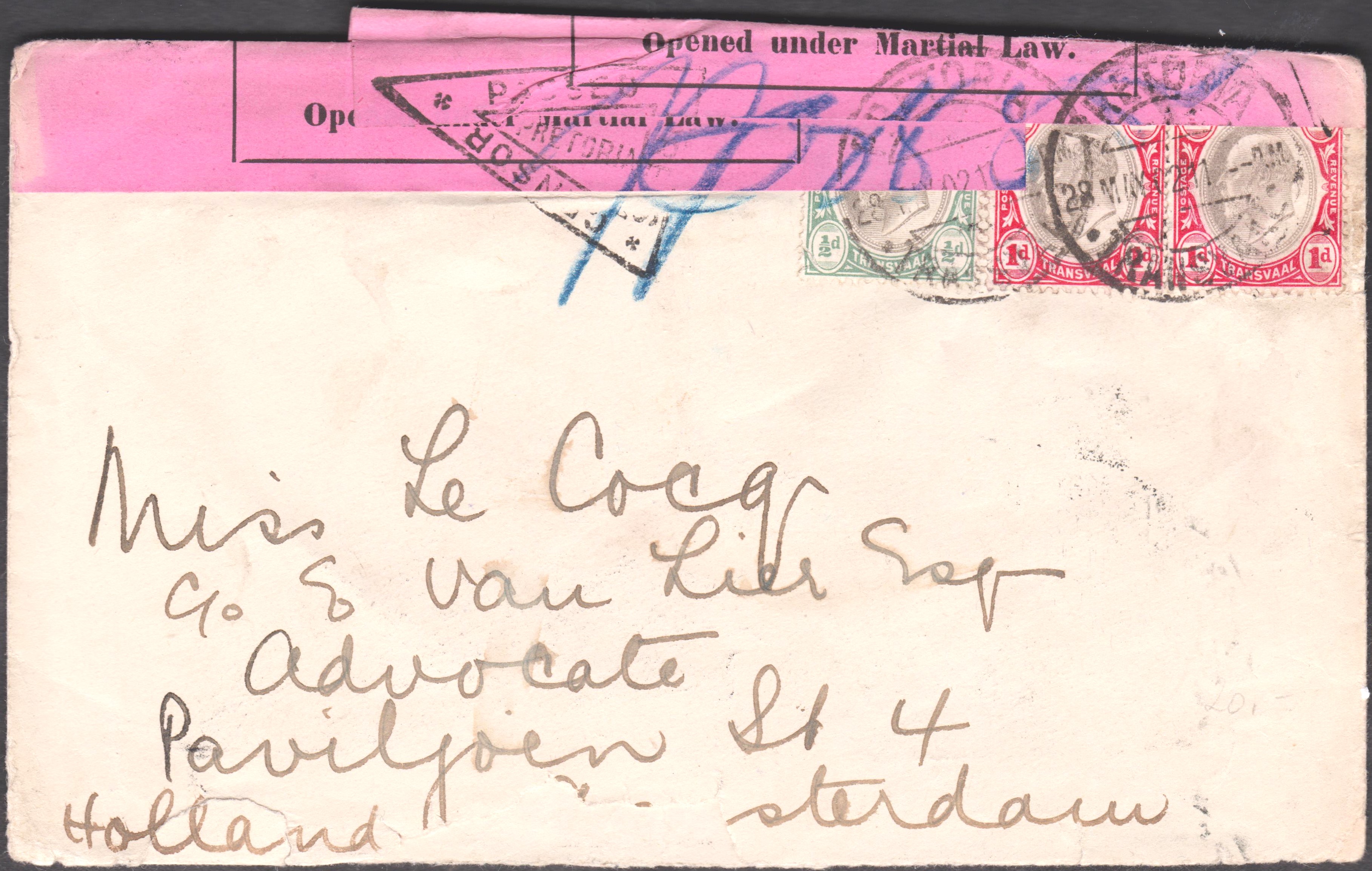 Der Brief lief in Pretoria die Zensur, wurde oben geöffnet und mit einem roten Verschlußstreien wieder verschlossen!