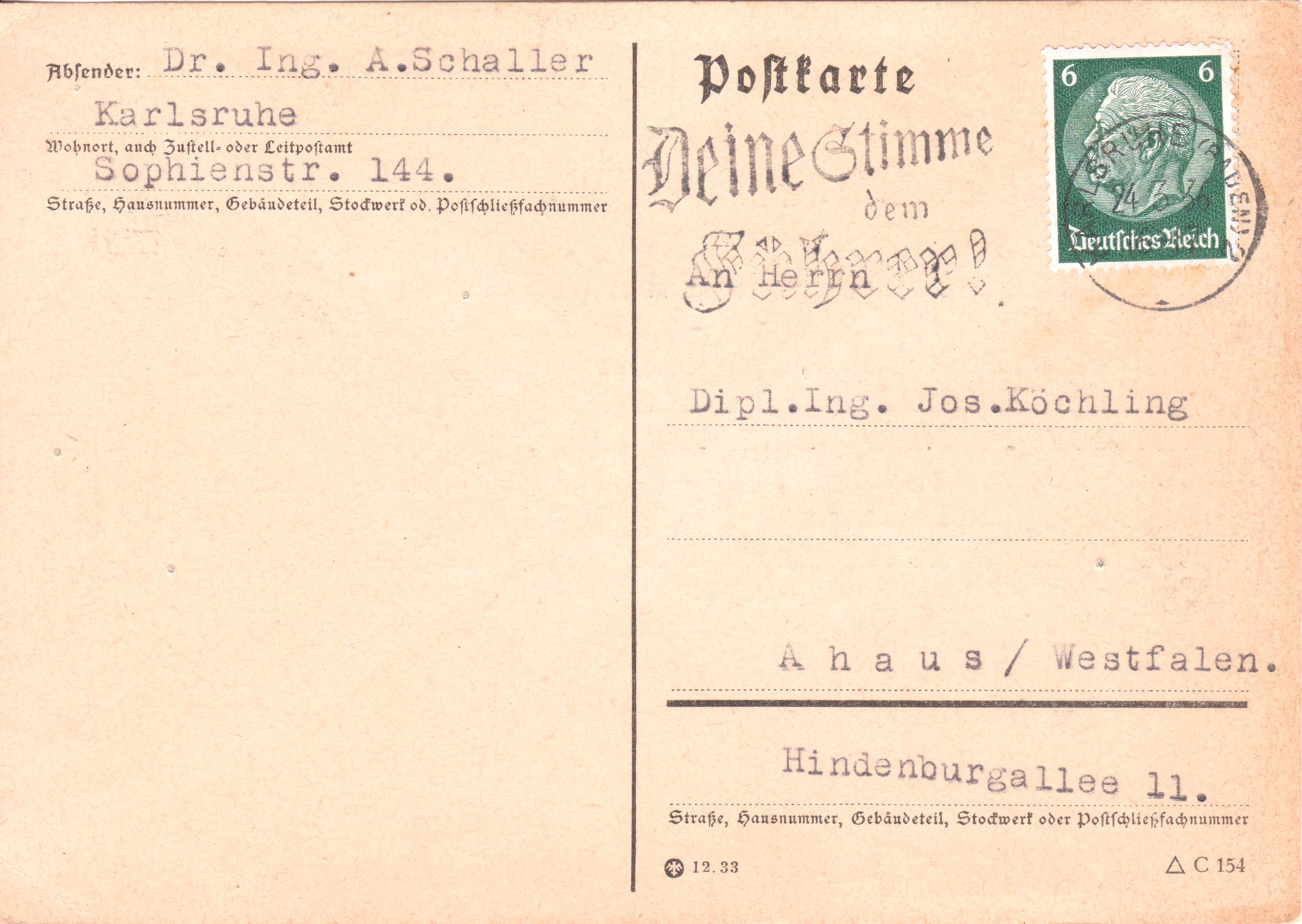 Diese am 24.03.1936 aufgegebene Postkarte dokumentiert per Maschinenstempeleinsatz die Reichstagswahl 1939: