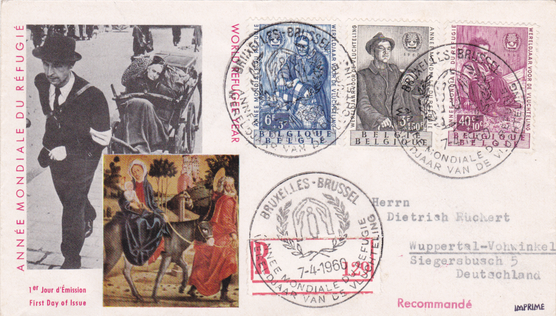 Brief per Einschreiben vom Ersttag der Serie aus Belgien (MiNr 1182 - 1187) zum Weltflüchtlingsjahr 1959 mit dem Sonderstempel aus Brüssel nach Wuppertal.