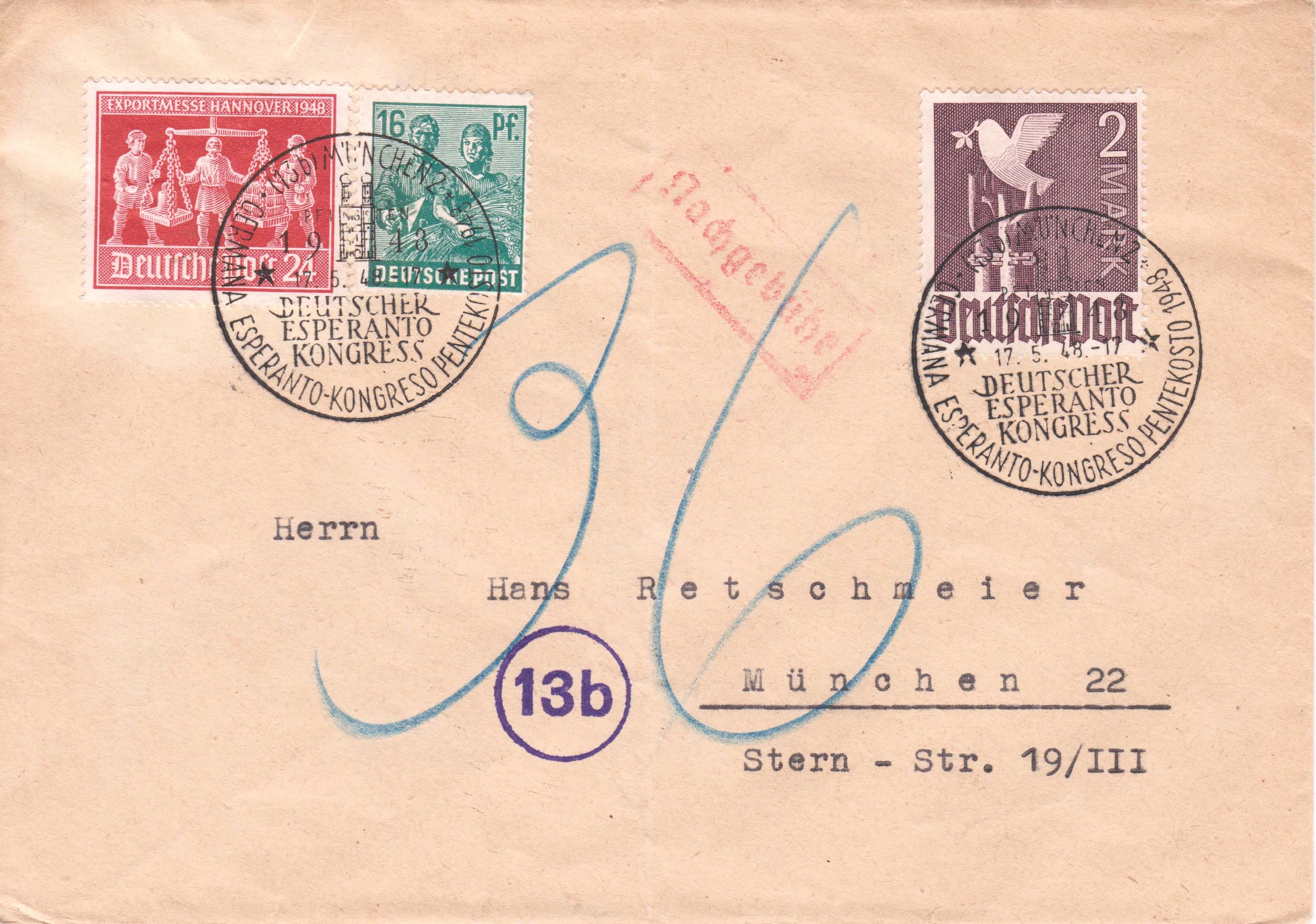 Portofreie "Postsache" mit Sonderstempel 6.8.51 zum 36. Internationalen Esperantokongress, der vom 04.-11. August 1951 mit 2040 Teilnehmern in München stattfand: