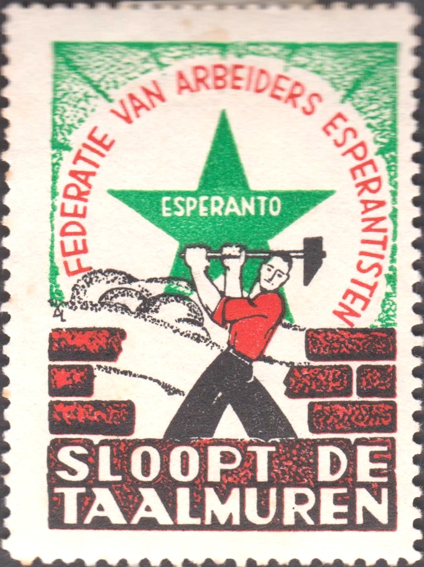 Niederländische Werbemarke "SLOOP DE TAALMUREN" (= Abriss der Sprachmauern) der "FEDERATIE VAN ARBEIDERS ESPERANTISIEN" (= Föderation der Arbeiter-Esperantisien):