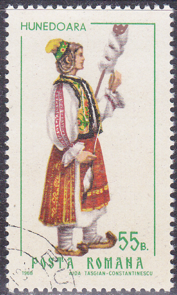In der gleichen Serie aus dem Jahre 1968 erschien in Rumänien diese Marke (MiNr 2734) mit einer Frauentracht aus Hunedoara (eine Stadt in Rumänien; sie liegt im Kreis Hunedoara in der Region Siebenbürgen).