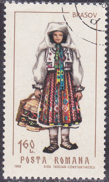 Aus der gleichen Serie aus dem Jahre 1968 aus Rumänien kommt diese Marke (MiNr 2736) mit einer Frauentracht aus Brașov (eine Stadt in Rumänien; sie liegt in der Region Siebenbürgen).