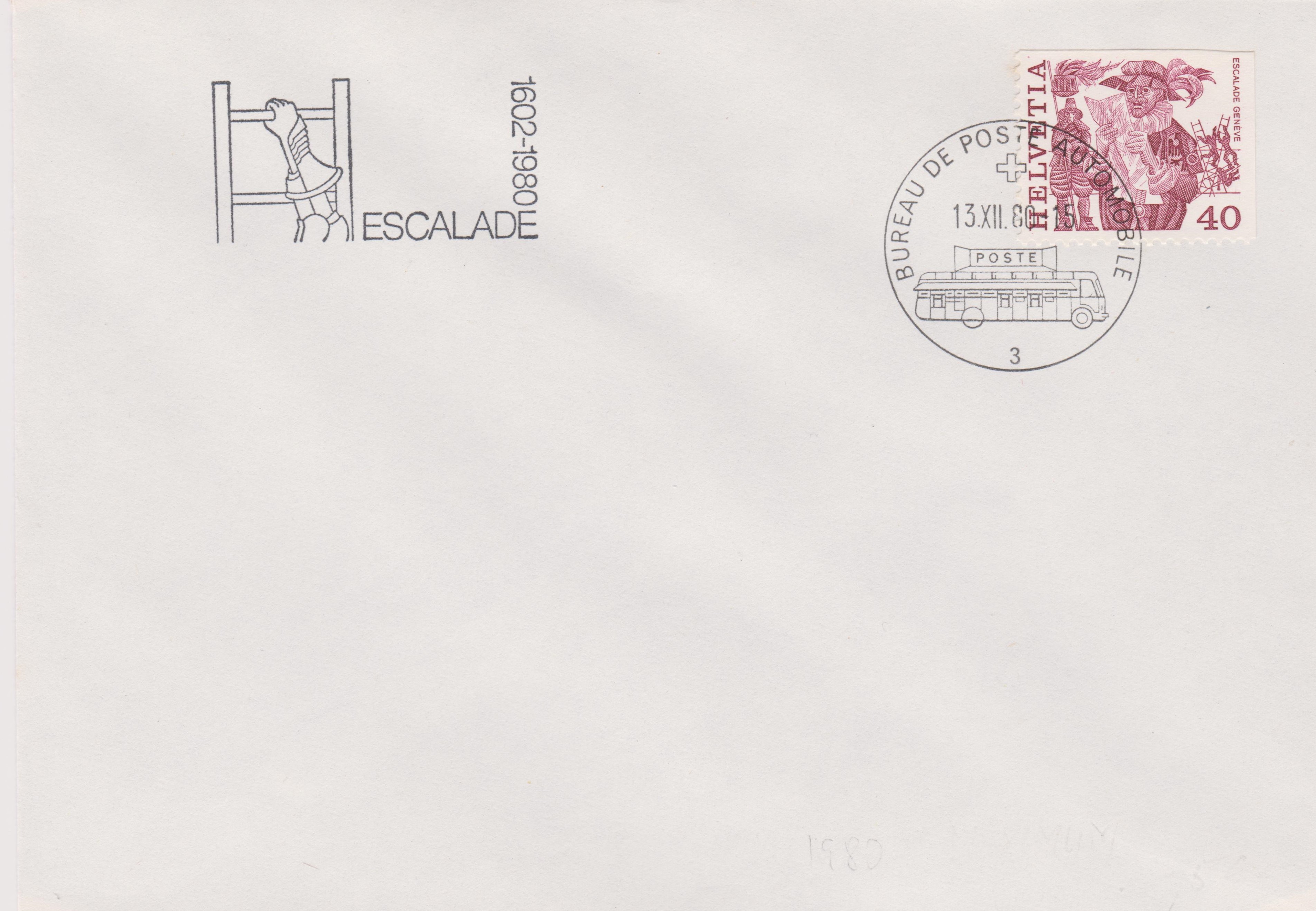 Schweiz MiNr. 1104 aus der Dauerserie Volksbräuche würdigt dieses historische Ereignis, hier als MiNr. 1104 Eor, oben sowie rechts geschnitten, aus Markenheftchen, entwertet im "BUREAU DE POSTE AUTOMOBILE" = Automobilpostbüro = Postbus, am 13.12.1980: