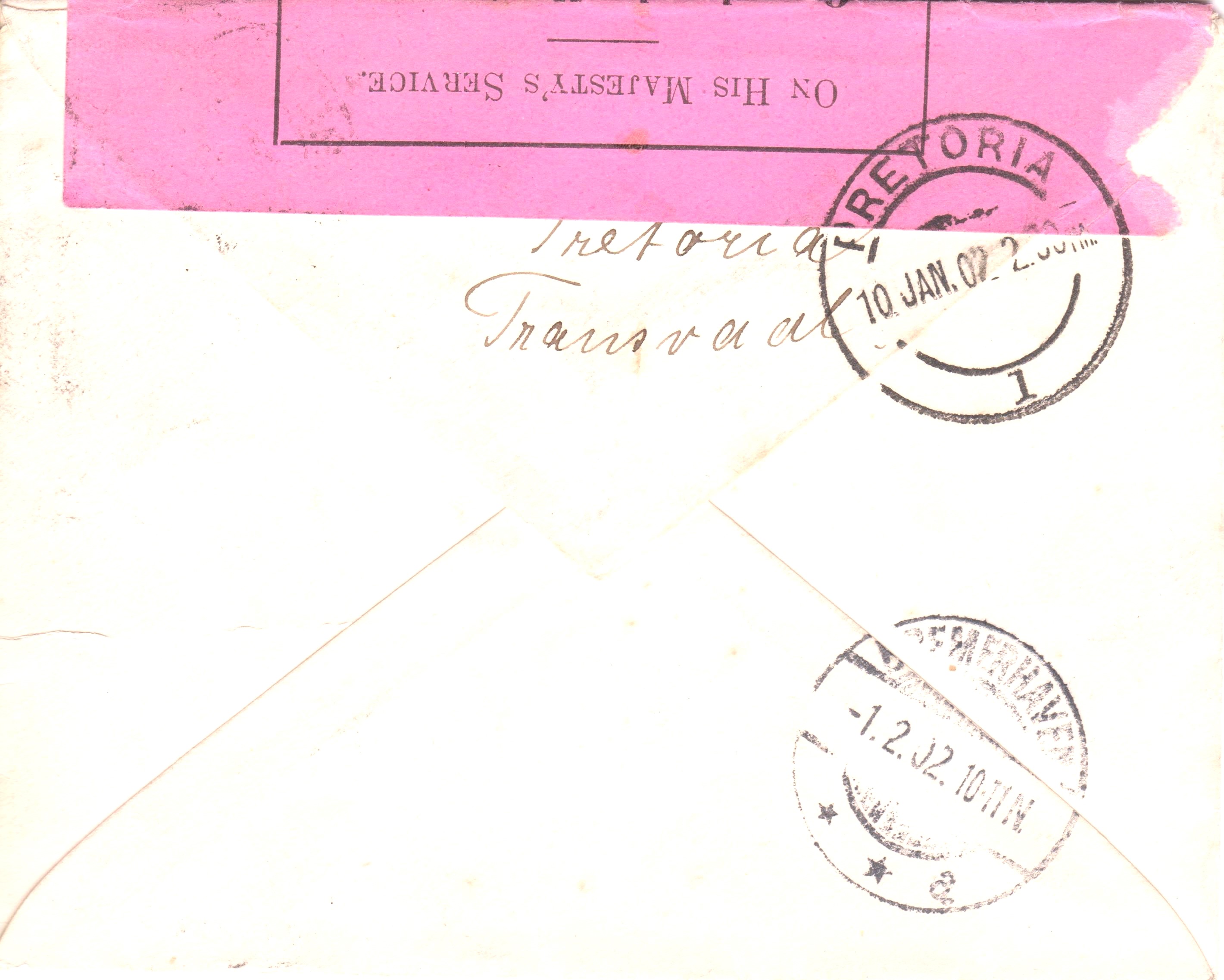 Dieser nach Bremen adressierte Brief wurde am 10.01.1902 in PRETORIA aufgegeben und kam am 01.02.1902 an seinem Bestimmungsort BREMERHAVEN an.