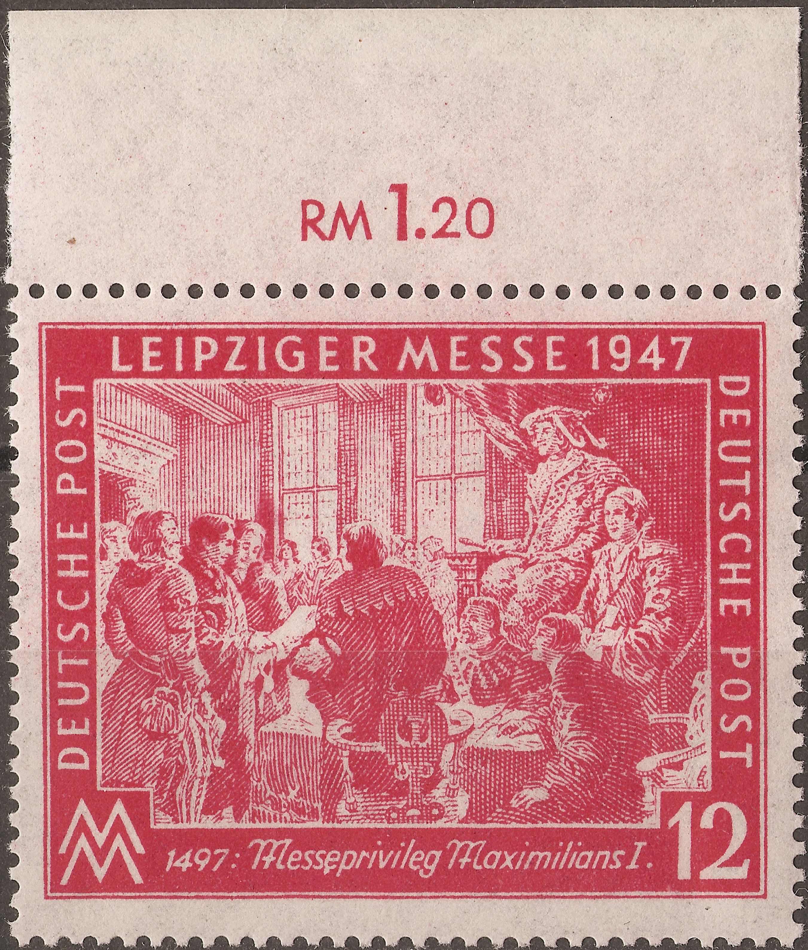 Postfrische Einzelmarke mit Michel-Plattenfehler IX: roter Punkt im ersten Abstrich des "M" von "Messeprivileg" (Feld 16).