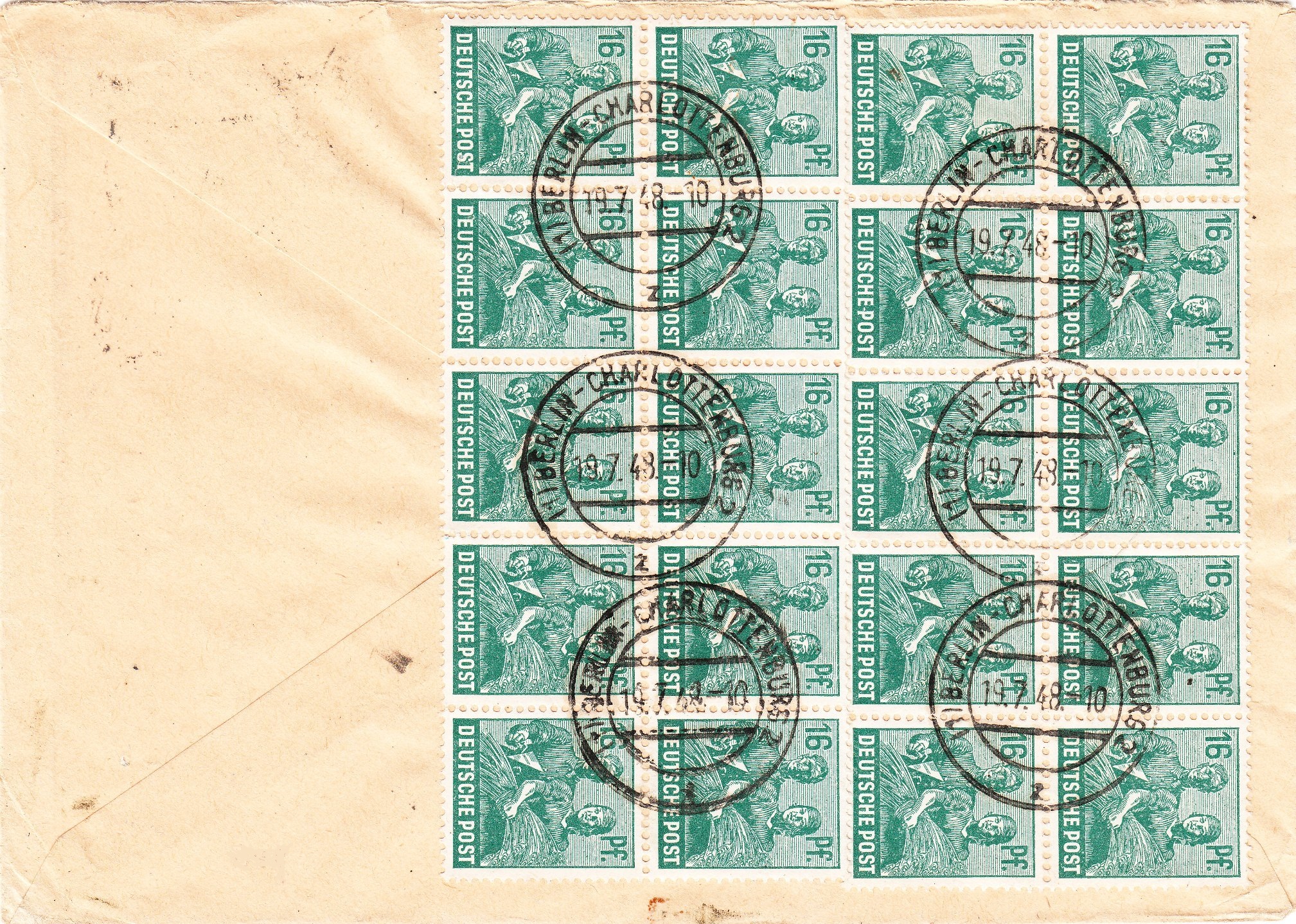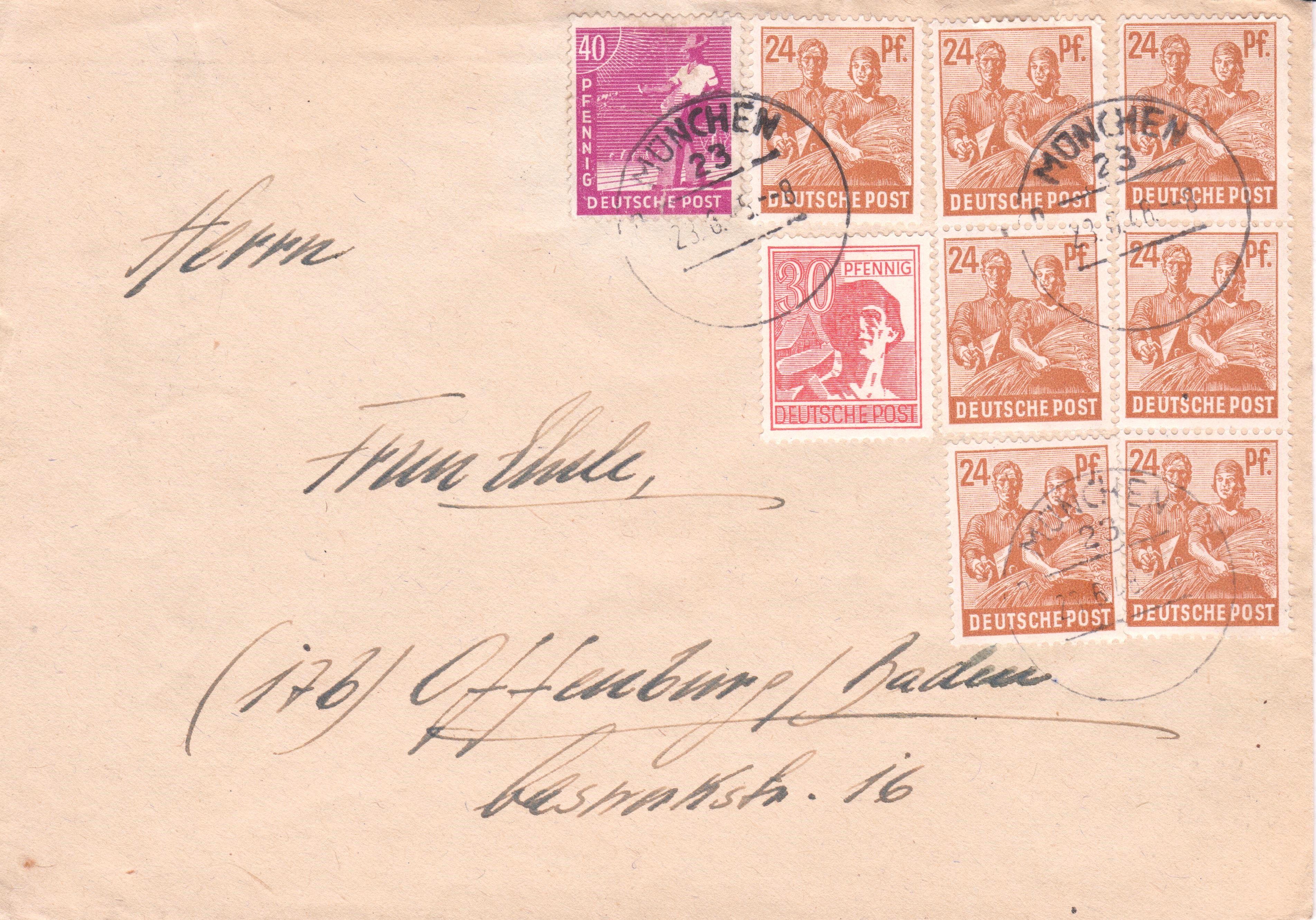 Zehnfachfrankatur der Kontrollrat-Arbeiterserie, aufgegeben am 23.06.1948 um 8 Uhr morgens in MÜNCHEN 23 auf Brief im Fernverkehr nach "17 b Offenburg":