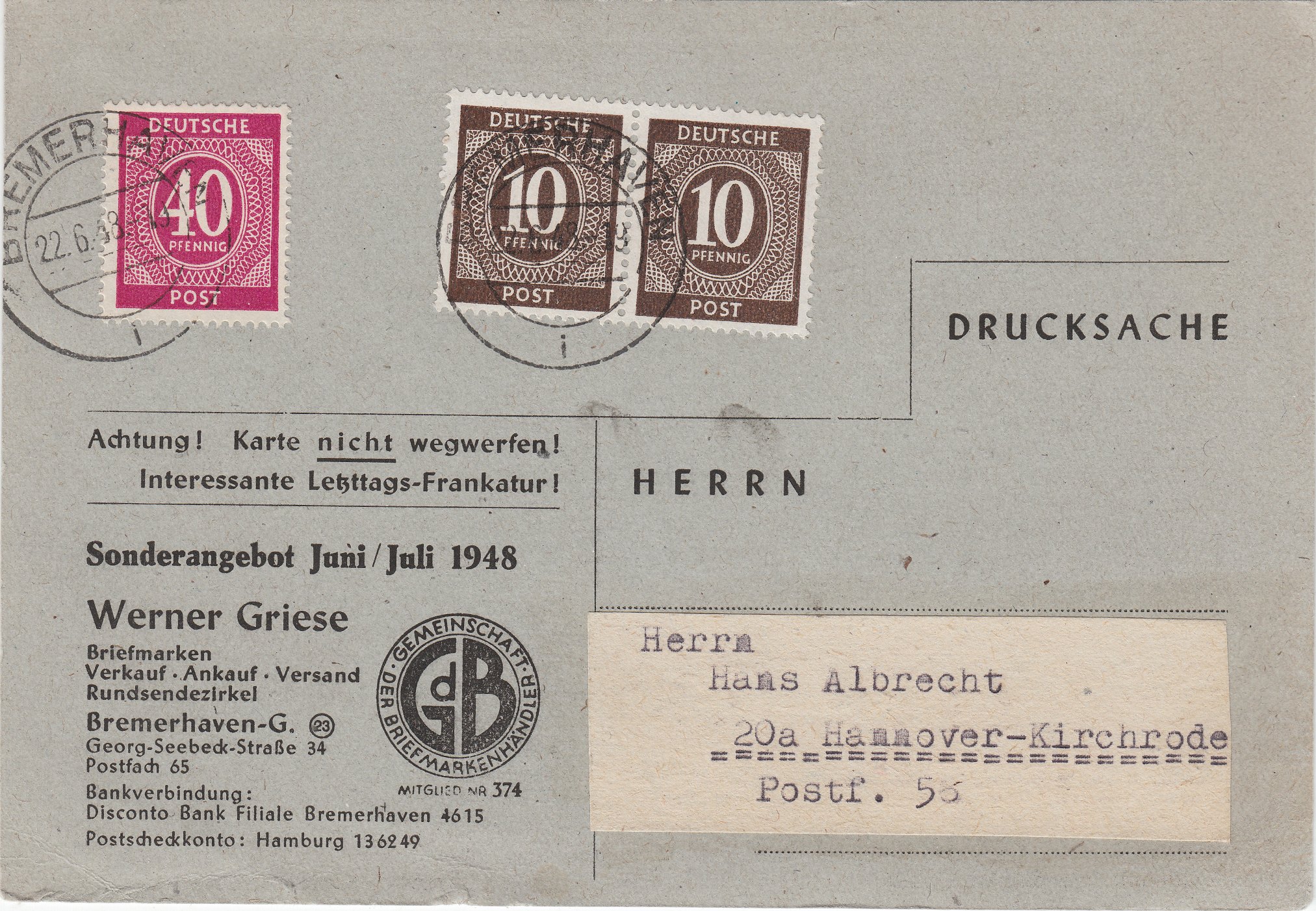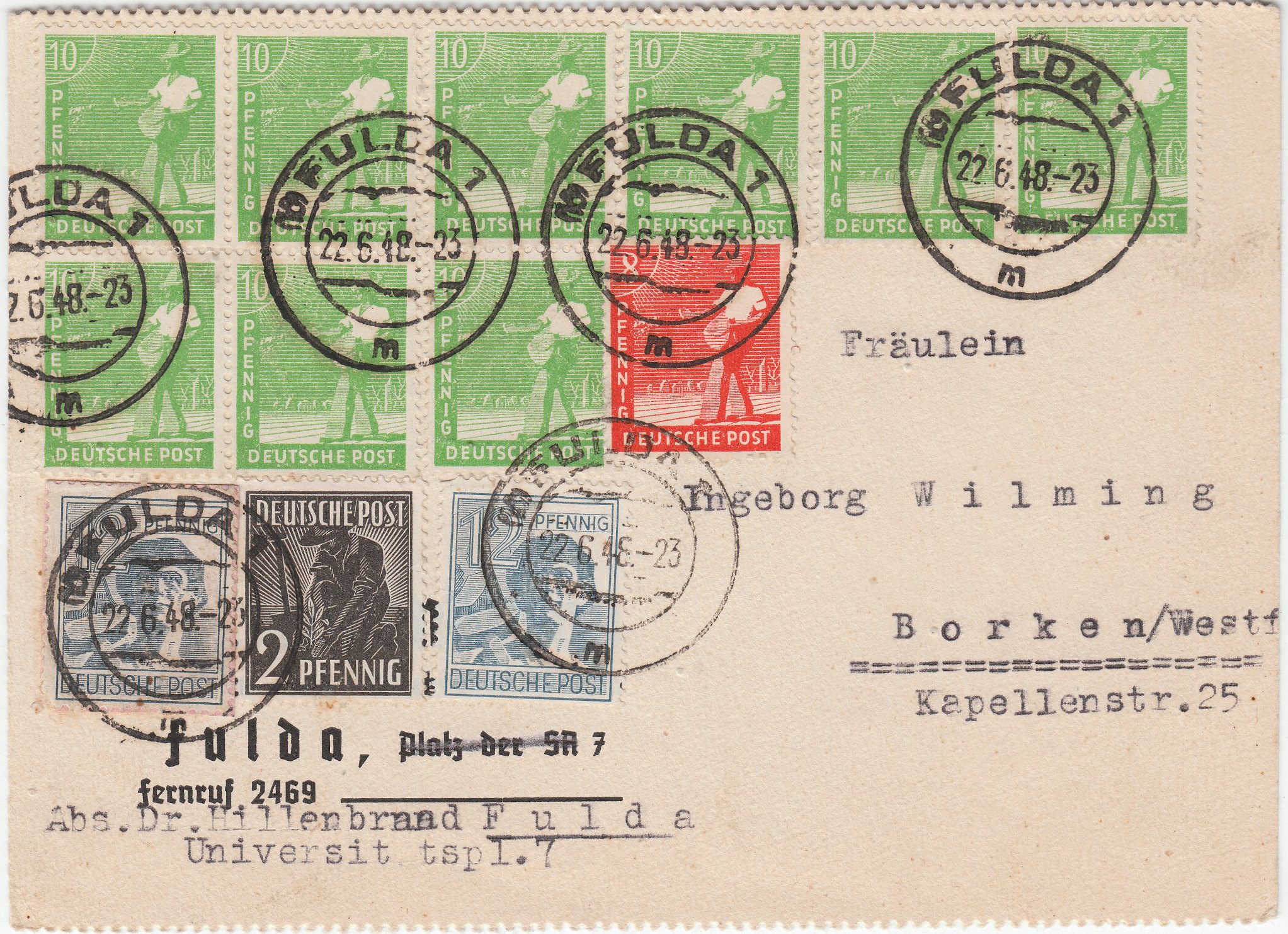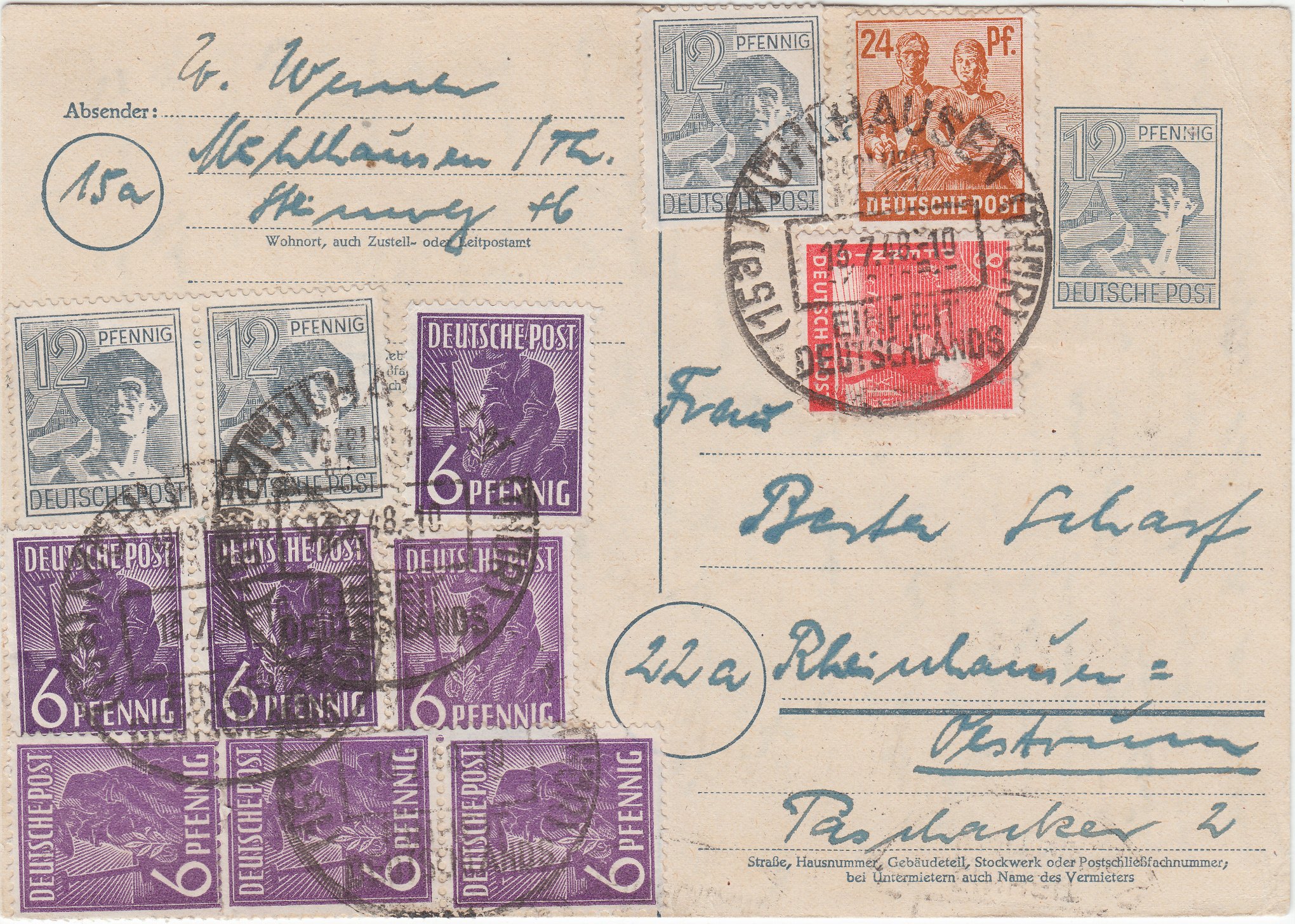 Bei diesem Beleg wurden die Postwertzeichen der Kontrollrat-Arbeiterserie als "erste Briefkastenleerung" am 23.06.1948 noch als frankaturgültig anerkannt und es wurde keine Nachgebühr erhoben!