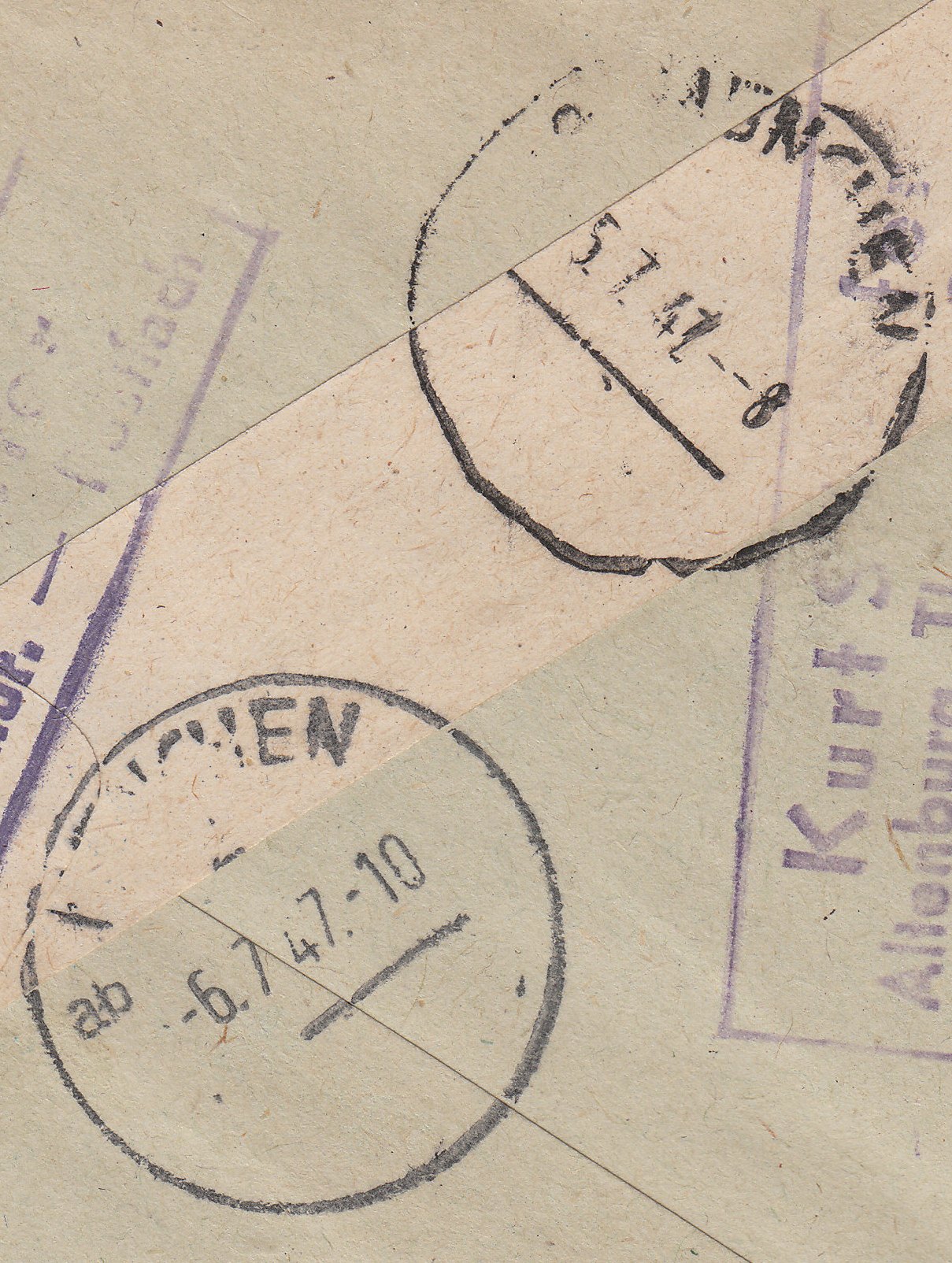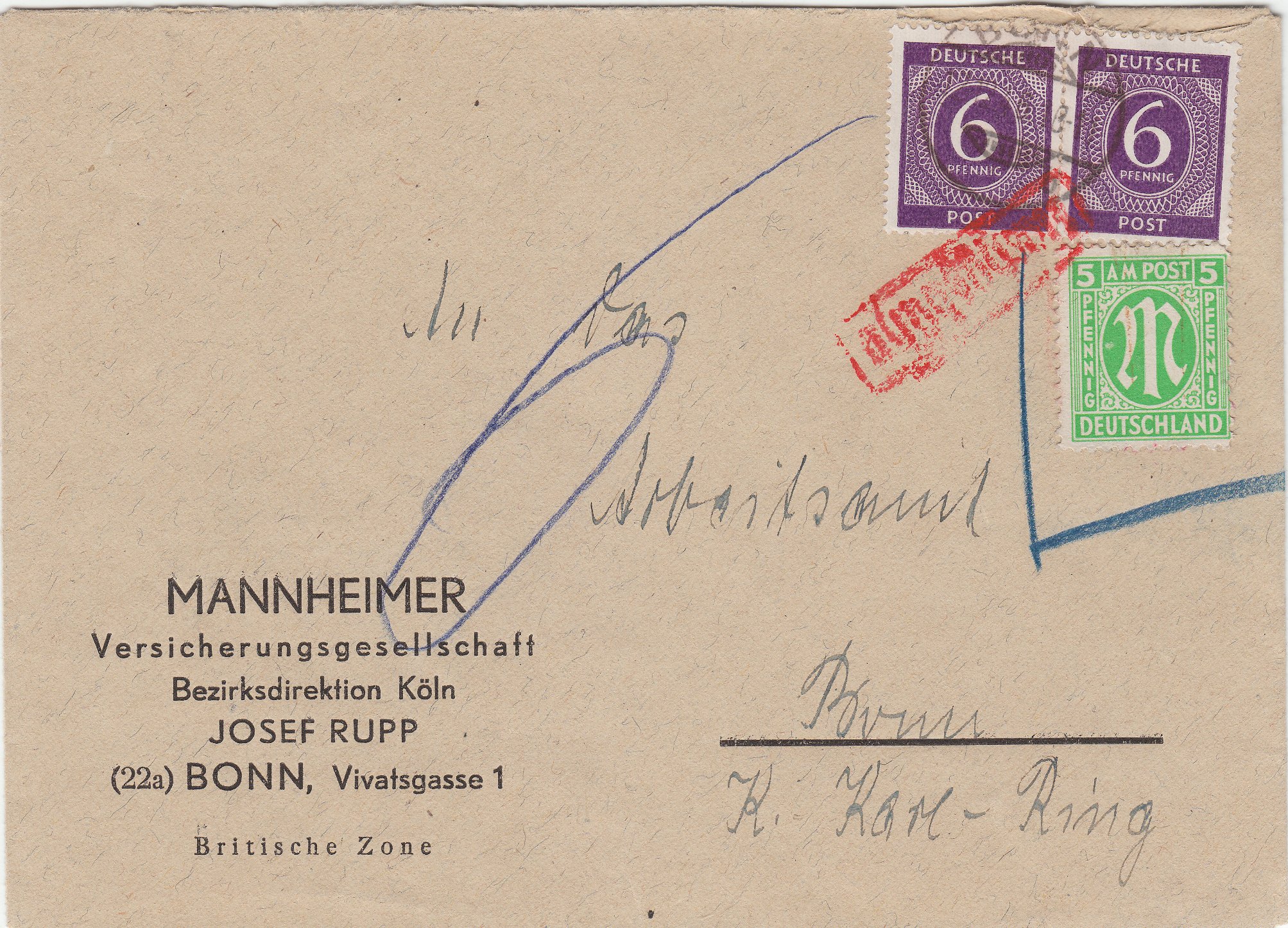 Die Ungültigkeit der AM-Post-Marke wurde von der Post sofort festgestellt und dieses Postwertzeichen wurde nicht mit abgestempelt, sondern durch Umrahmung per Blaustift als ungültig markiert.