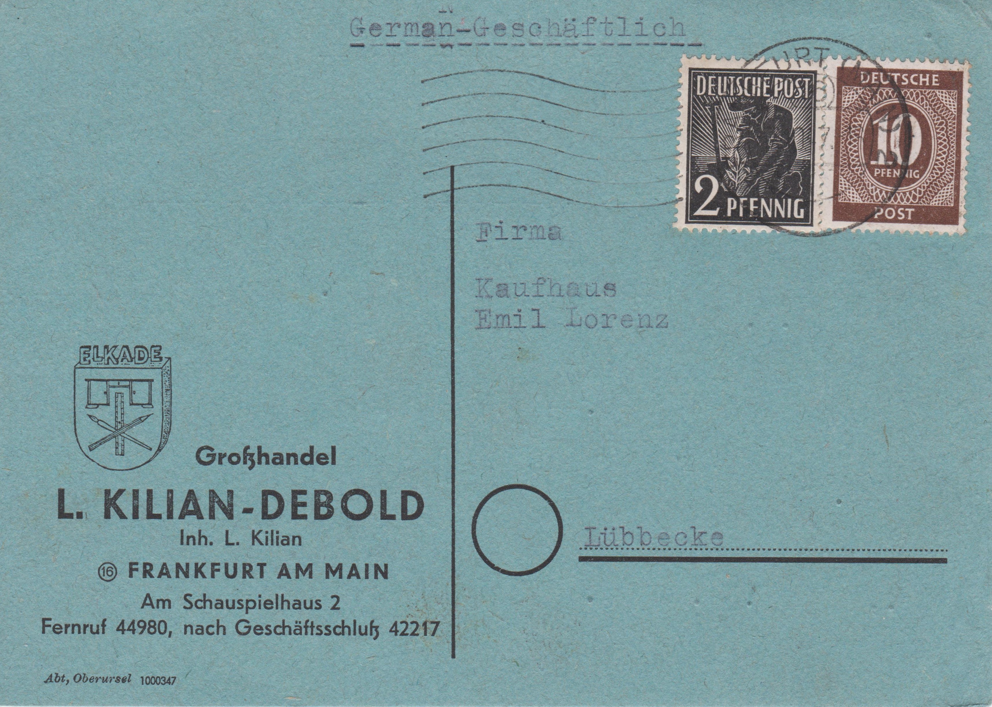 Postkarte mit 10 Pf Ziffer und 2 Pf Arbeiter, als Firmenbedarfspost von FRANKFURT nach Lübbecke gelaufen: