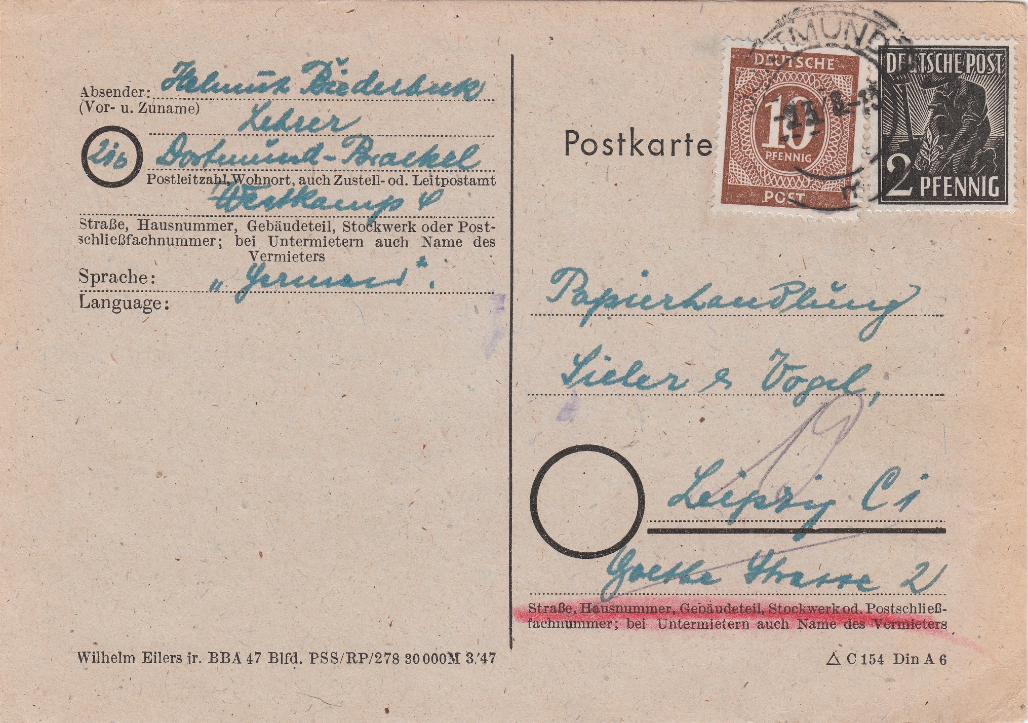 Hier ein hübsches Beispiel in Form einer Postkarte mit 10 Pf Ziffer und 2 Pf Arbeiter, als Firmenbedarfspost von Dortmund nach Leipzig gelaufen: