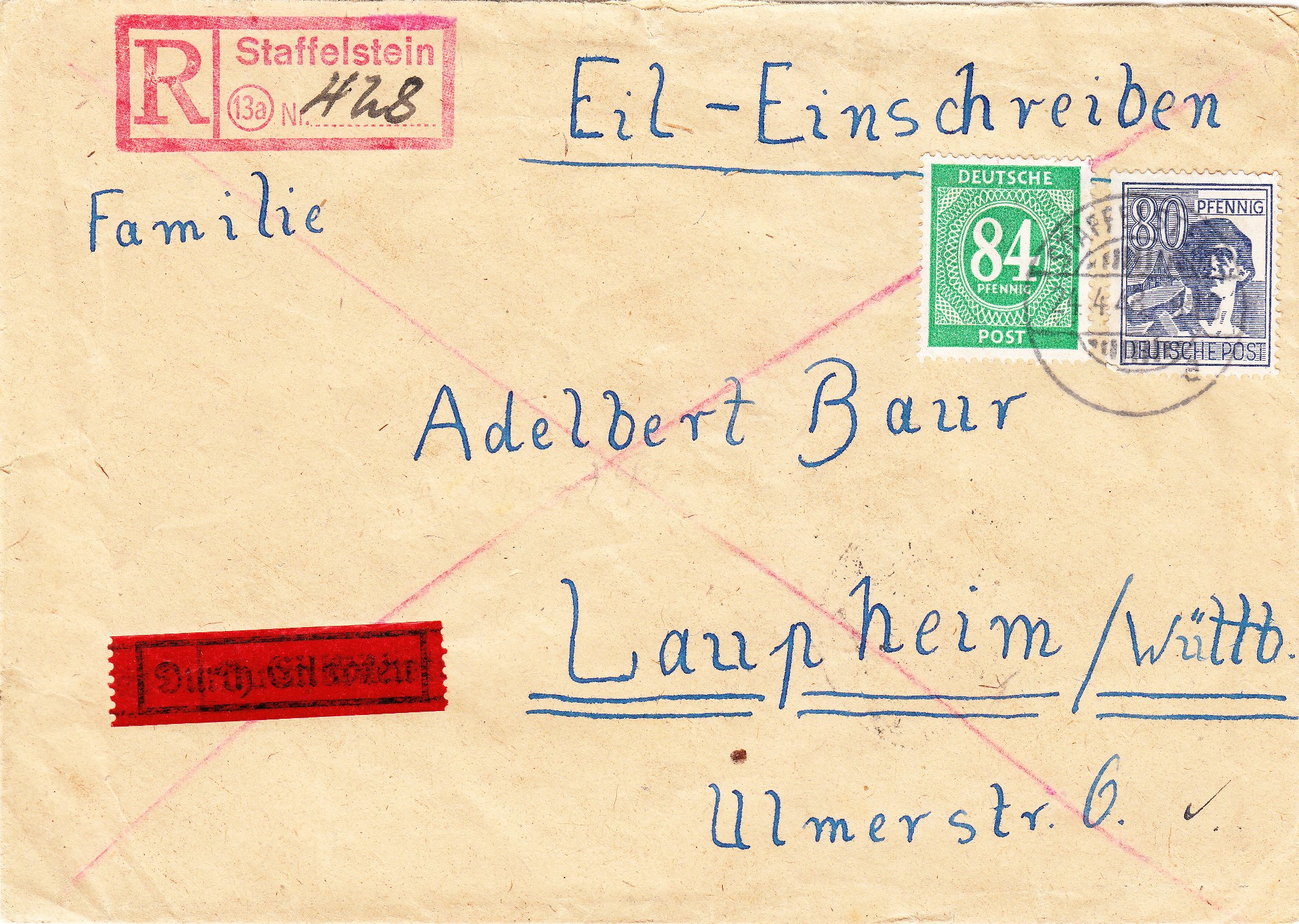 Interessant und heute schon recht schwierig zu finden sind Briefe, die mit 16 Pf frankiert sind und nicht denselben Ort in Stempel und Anschrift zeigen.
