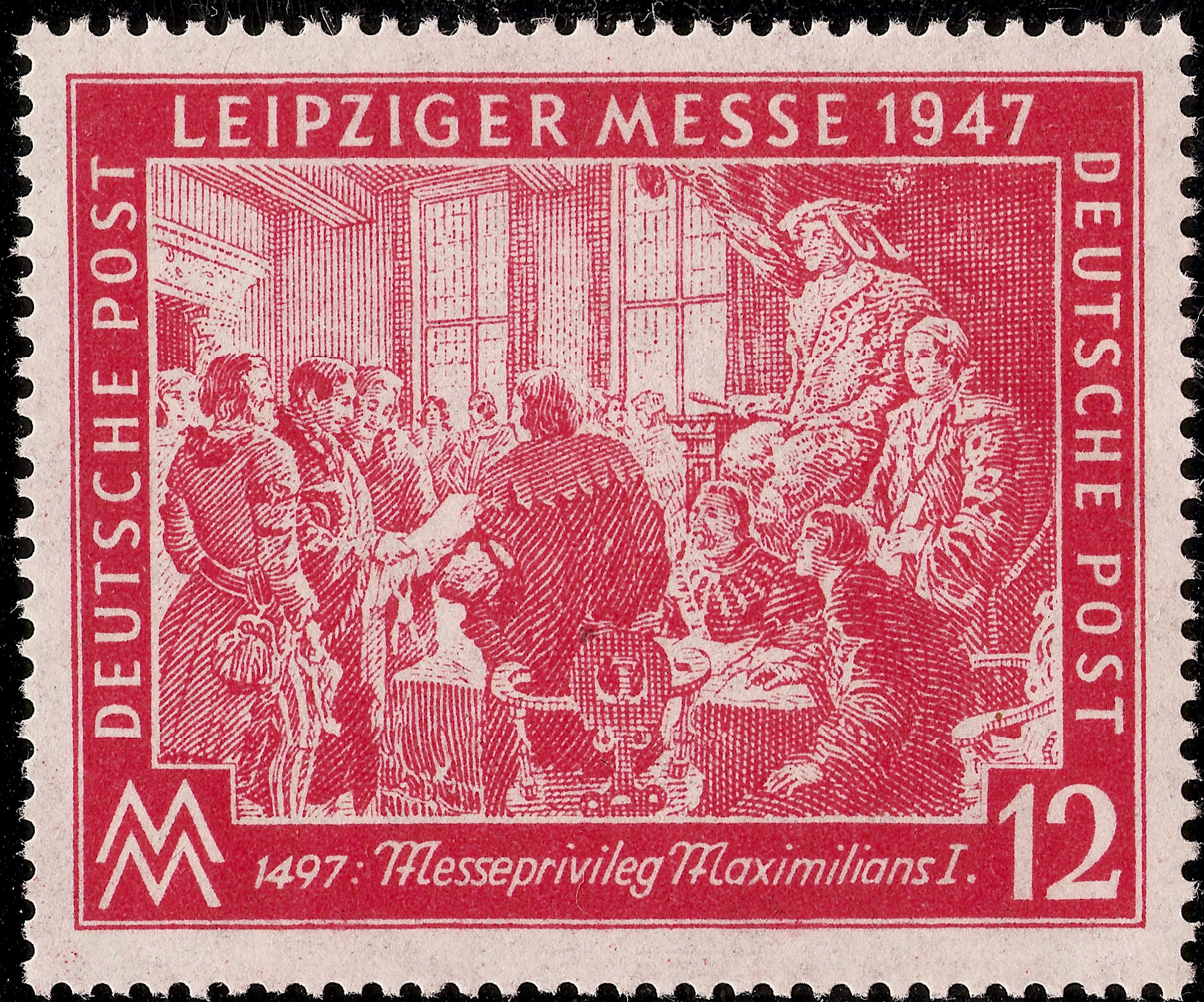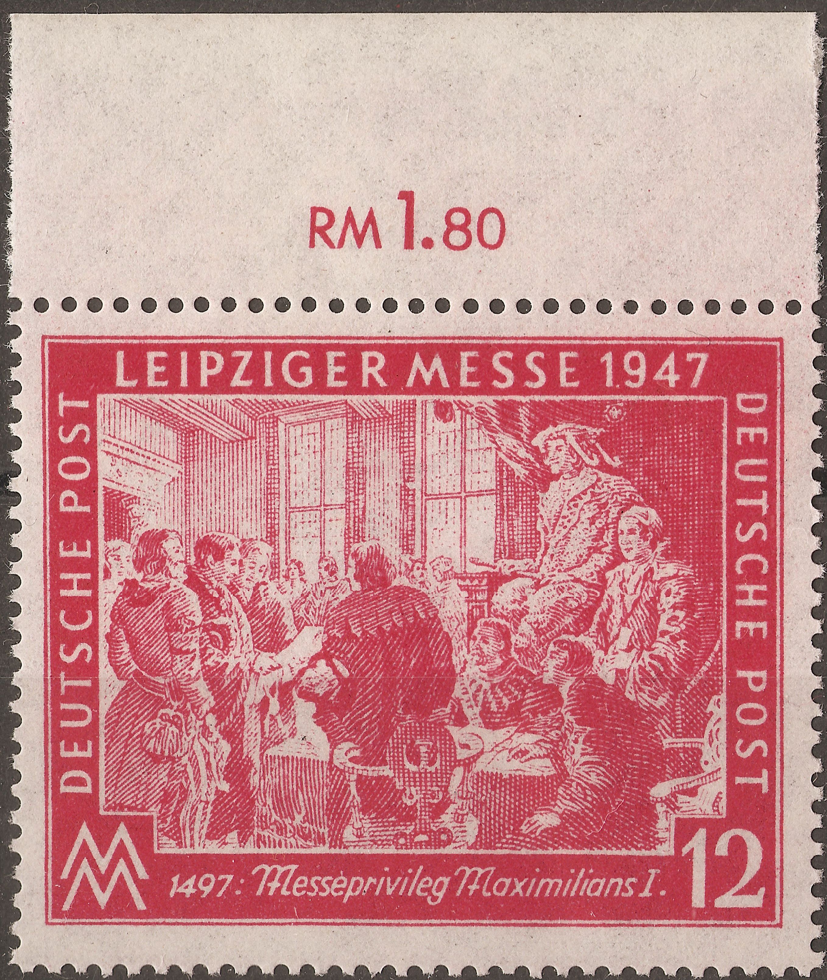 Postfrische Einzelmarke zur Leipziger Herbstmesse 1947. Die Marke erschien am 2. September 1947 und hatte eine Auflage von 10.000.000 Stück. Diese Marke hat wohl keinen bisher bekannten Plattenfehler.