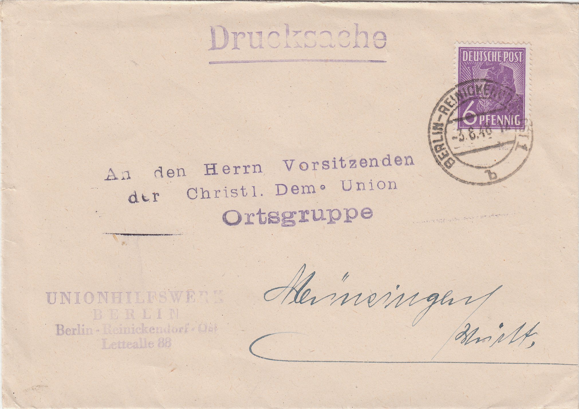 Die MiNr. 944 war als EF auf Drucksachen portogerecht vom 01.03.1947 als Erstausgabetag der Marke bis zum 22.06.1948. Hier ein schöner Bedarfsbeleg vom 03.06.1948, also aus dem letzten möglichen Verwendungsmonat, aufgegeben in Berlin-Reinickendorf und gelaufen nach Münsingen in Württemberg:
