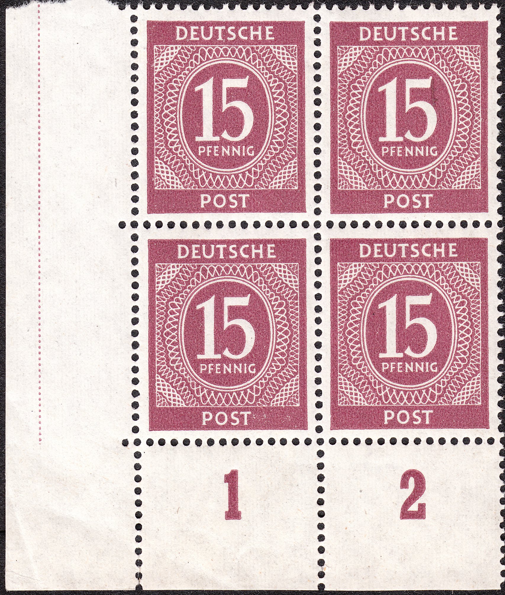 Der 15 Pf Wert der Kontrollrat Ziffernserie in bräunlichlila zeigt bei der HAN 442-45.2 bei der Reihenwertzahl im Oberrand von Feld 2 den Plattenfehler "Auslauf des Kommas deformiert":