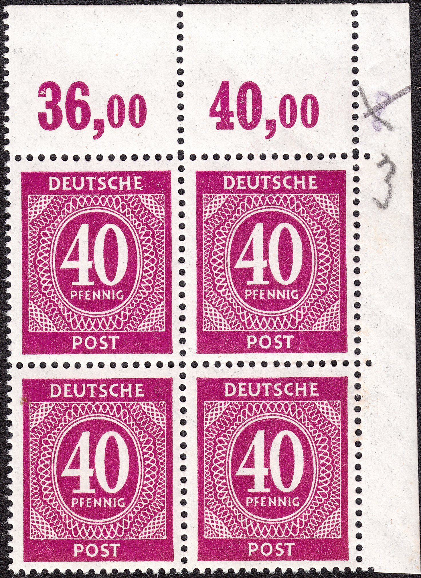 Beim 40 Pf Wert der Kontrollrat Ziffernserie kommt im Oberrand von Feld 9 bei der Reihenwertzahl "36,00" der Plattenfehler "3 von 36 beschädigt" vor. Hier gleich zwei Beispiele, jeweils als Eckrand-Viererblock OR dgz in verschiedenen Farben bzw. Farbtönungen: