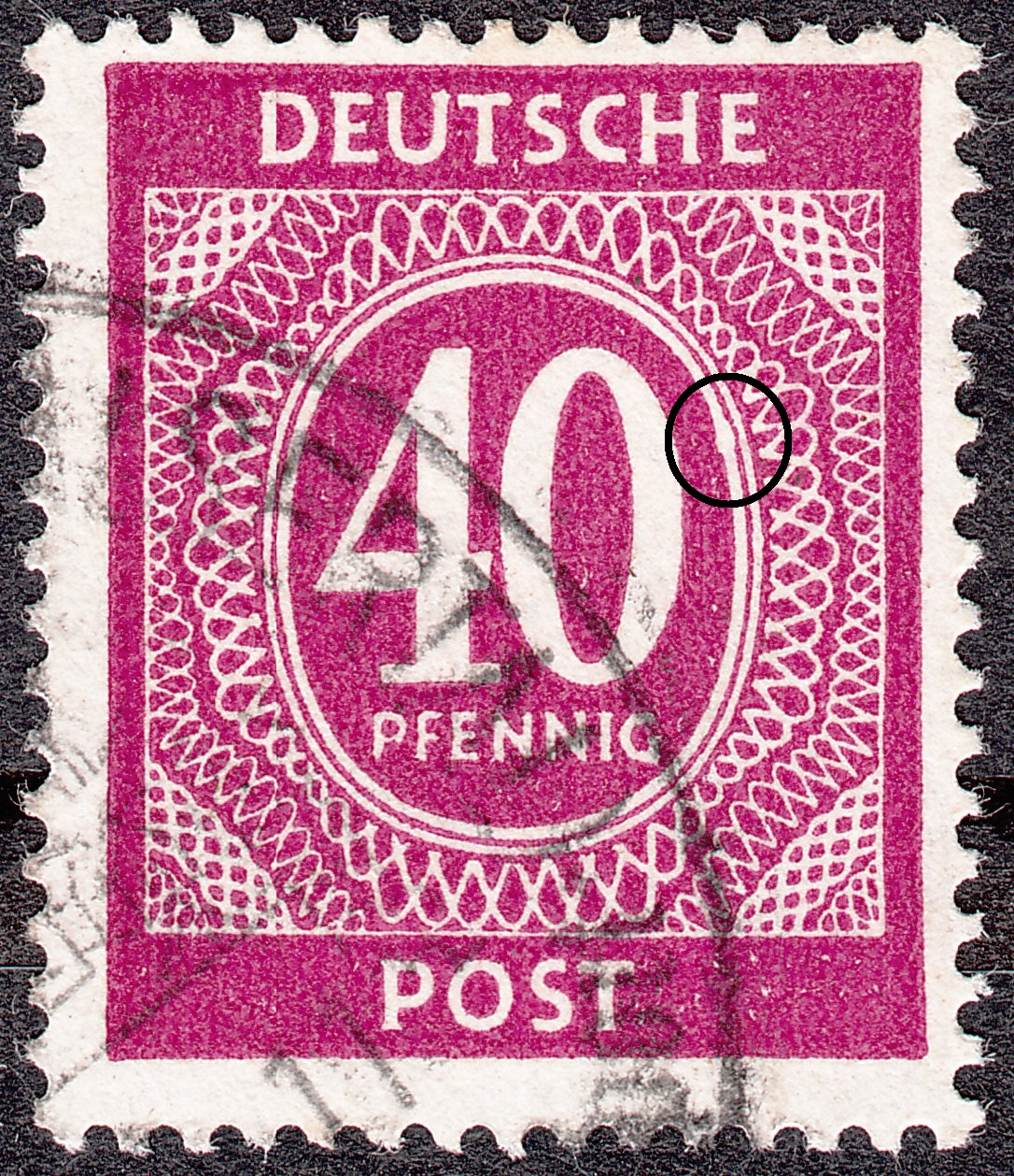 Beim 40 Pf Wert der Kontrollrat Ziffernserie kommt bei HAN 4034-46.1 auf Feld 71 der hier gezeigte Plattenfehler "Verdickung der Ovallinie rechts von 40" vor: