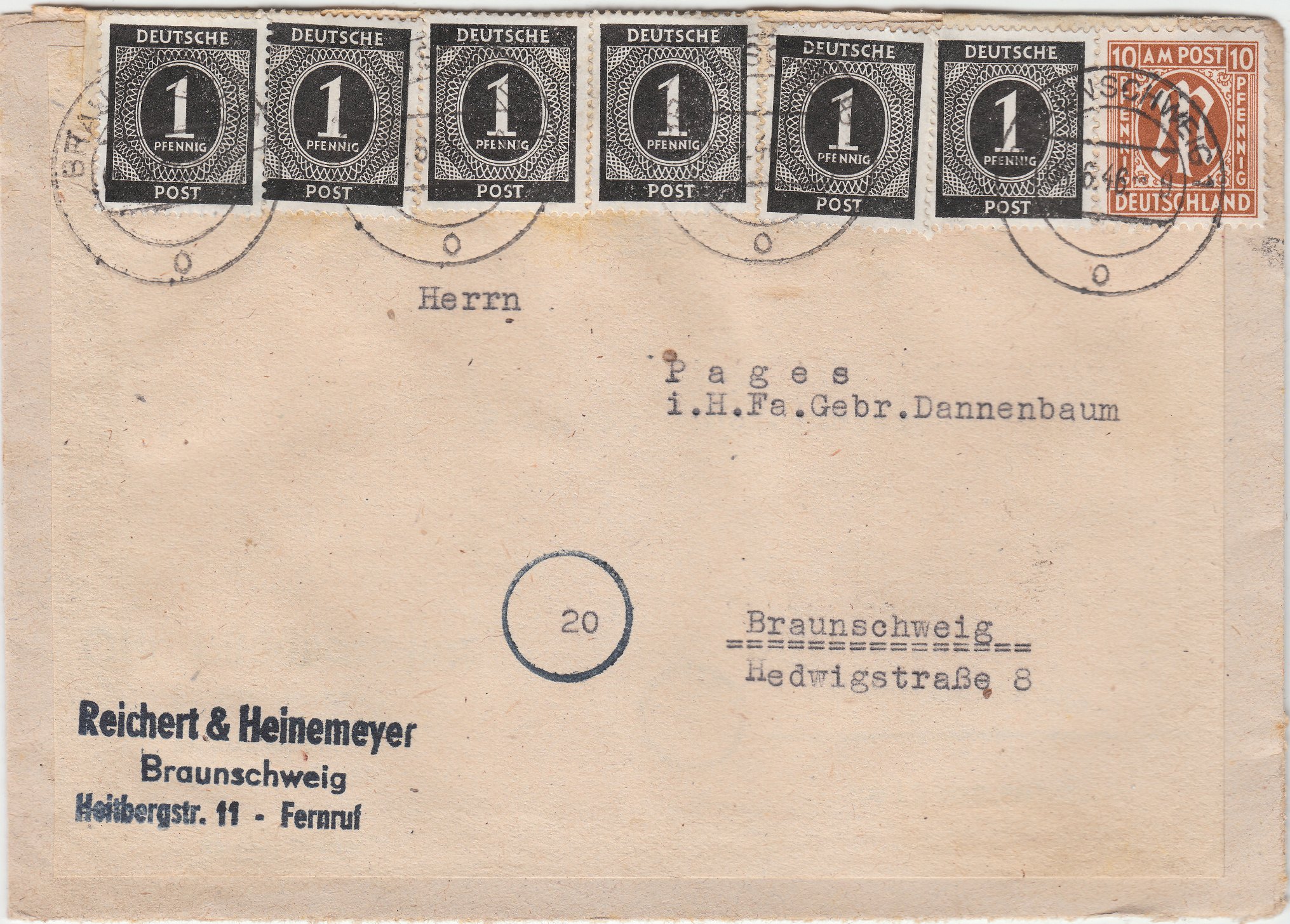 Hier gleich sechs Stück in Mischfrankatur mit einem 10 Pf Wert AM POST, Deutscher Druck, MiNr. 22, am 06.06.1946 portogerecht auf Ortsbrief innerhalb von Braunschweig gelaufen: