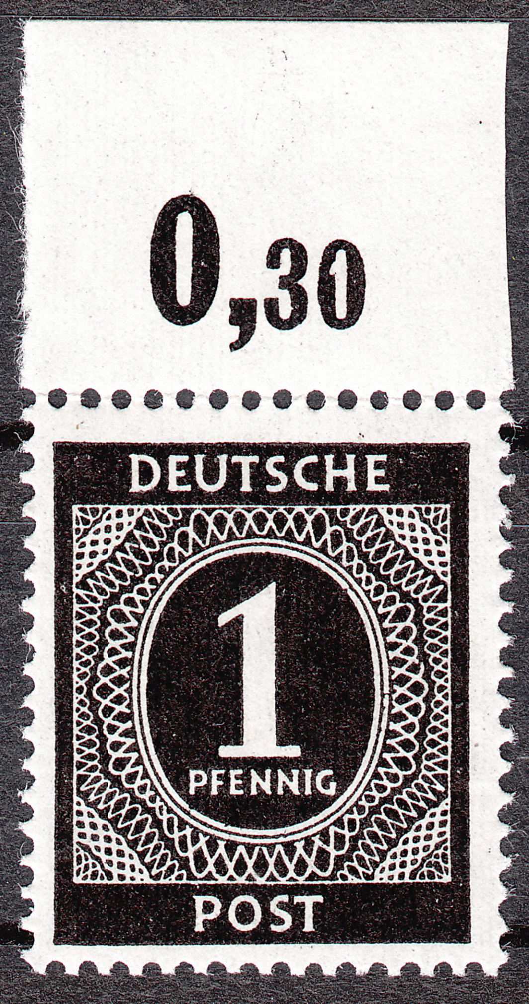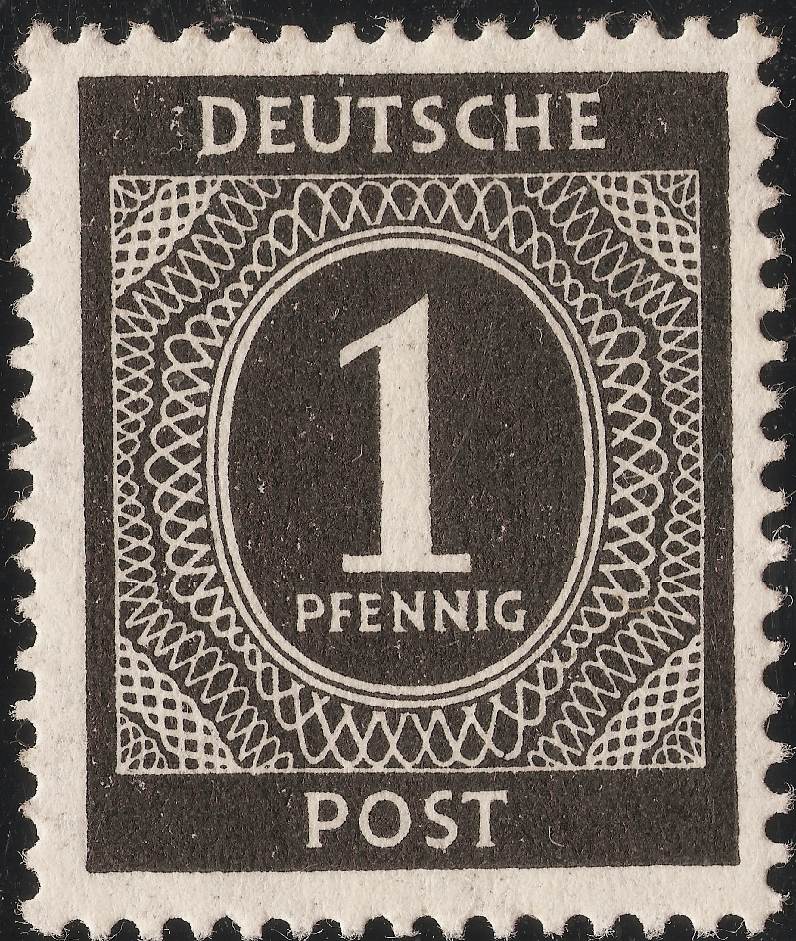 Den 1 Pf Wert der Kontrollrat Ziffernserie gibt es mit durchgezähntem Oberrand: